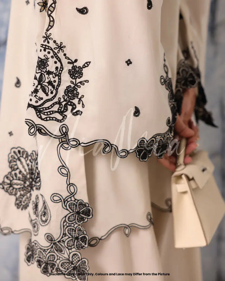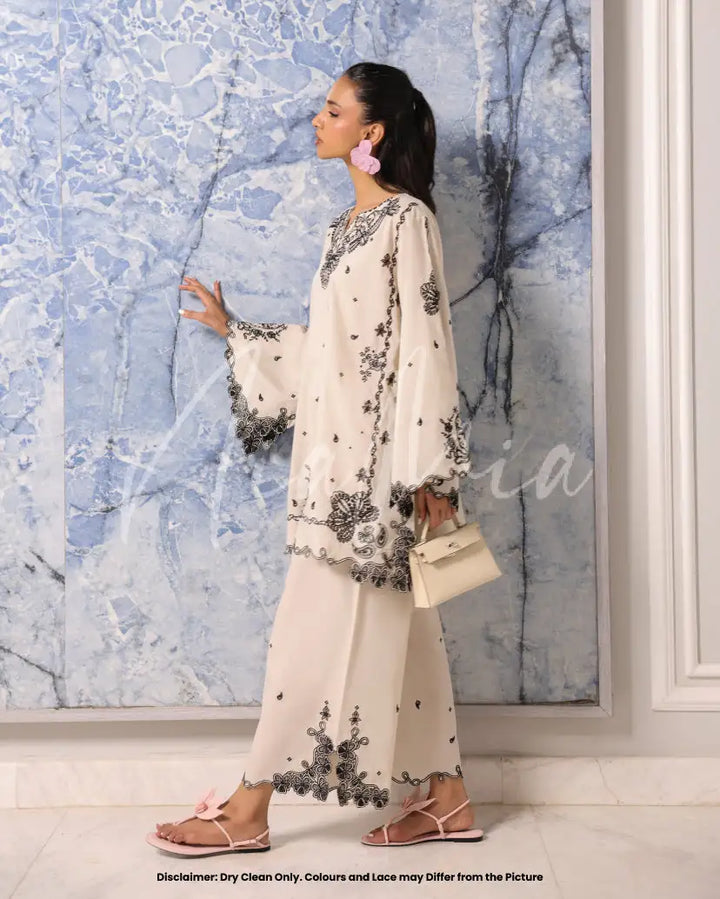 A cream cotton cambric co-ord set adorned with bold black threadwork that frames the neckline, sleeves, and borders with understated elegance. The flowing silhouette drapes effortlessly, complemented by wide-leg trousers that echo the same refined detailing.