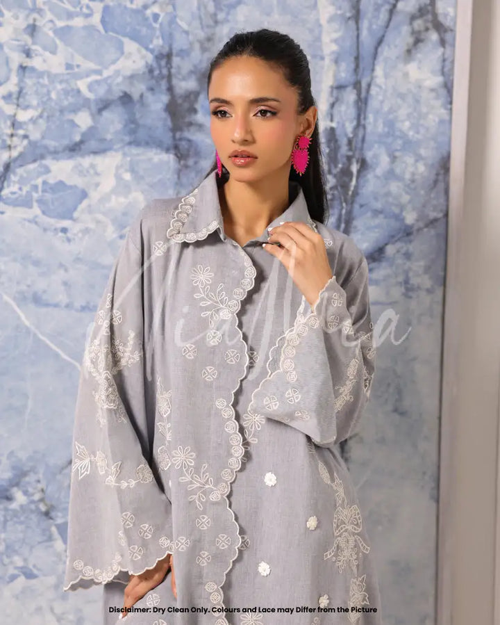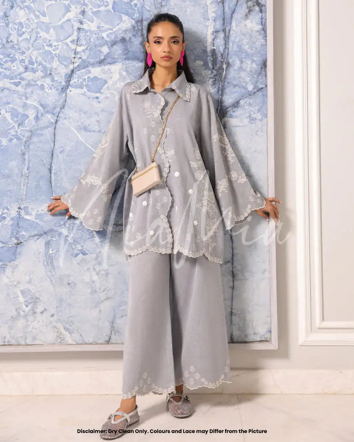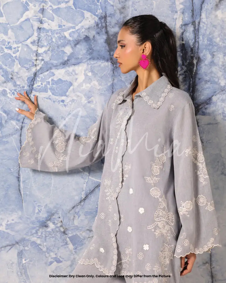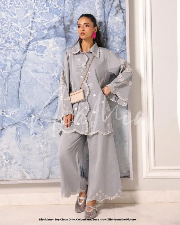 A soft dove-grey two-piece set crafted from breathable linen weave. The shirt features delicate embroidered floral motifs along scalloped edges and flared sleeves, creating a graceful silhouette. Paired with matching wide-leg trousers detailed with subtle embroidery, Skye brings understated charm and relaxed elegance to the season.
