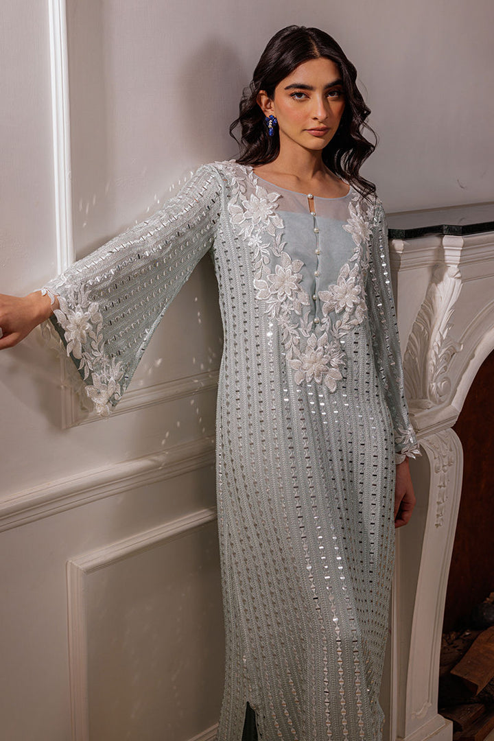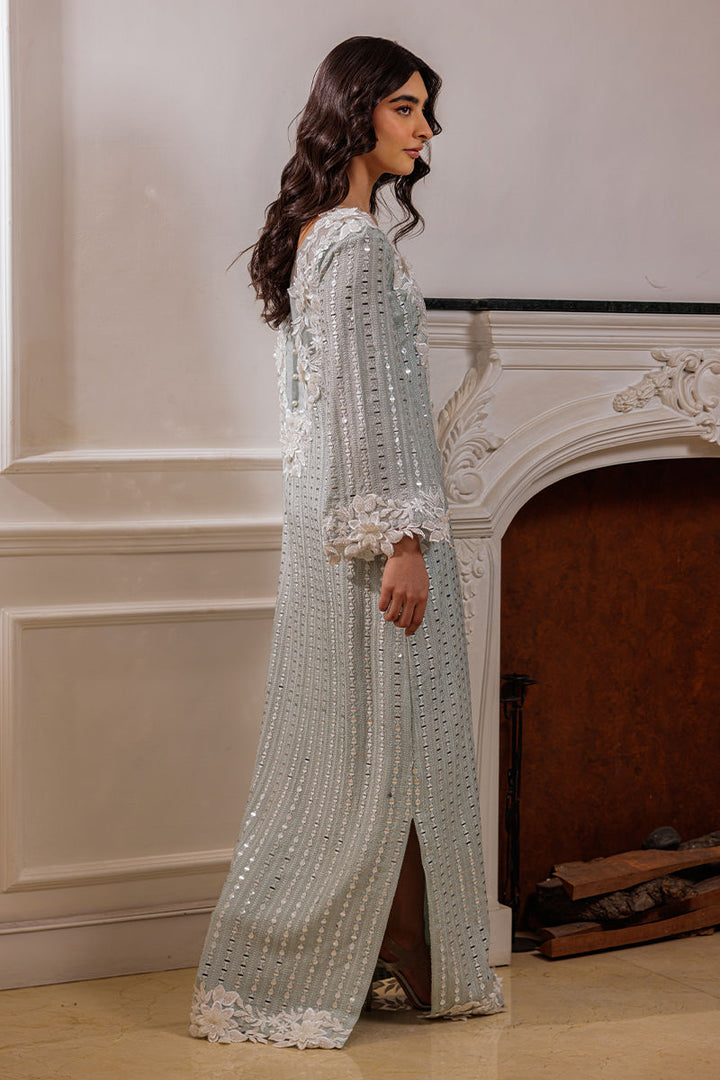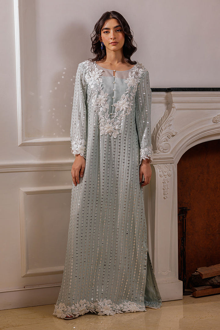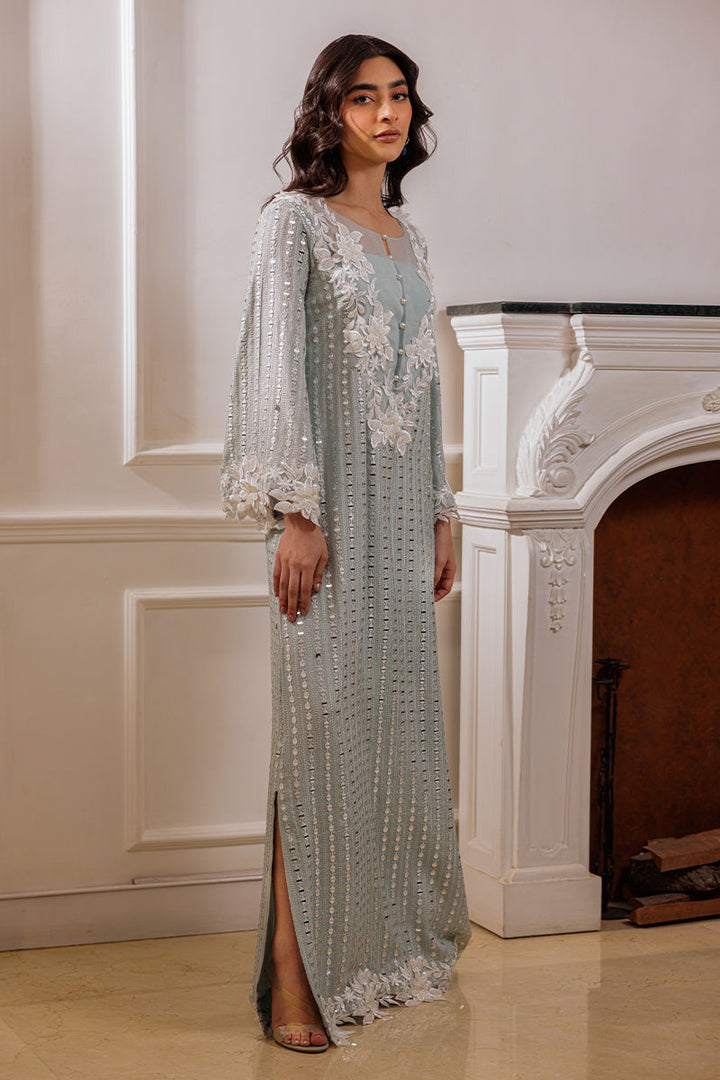 The Nikita bluish-green silk kaftaan shirt is adorned with delicate embroidery and foil work, complemented by cutwork 3D floral details on the neckline. Pearls embellish both the front and back neckline, as well as the sleeves, adding a luxurious touch. The design includes a side slit for an elegant finish.
