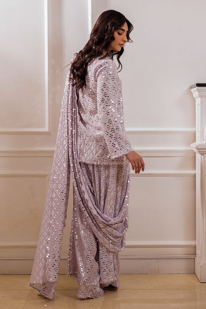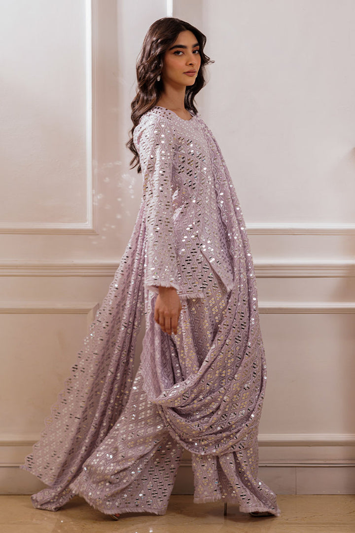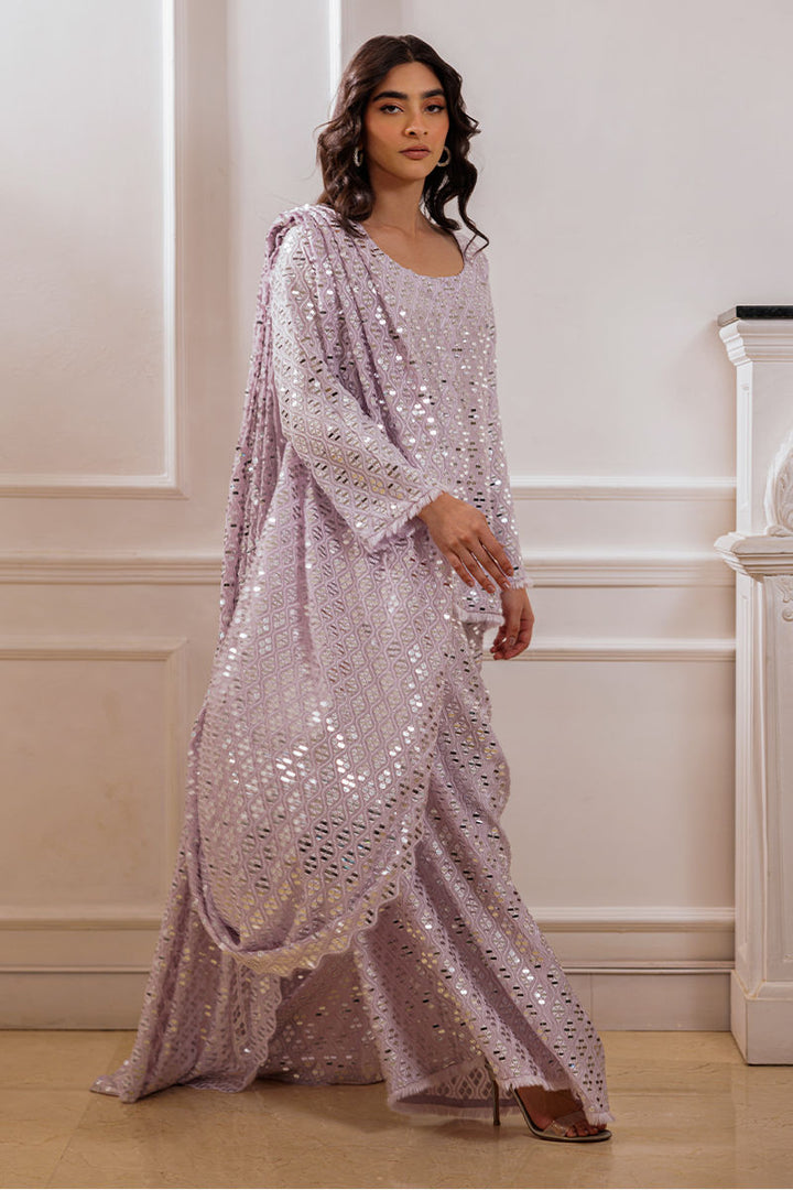 The Nyra ensemble features a lavender-hued shirt adorned with delicate thread and foil work throughout. The look is elevated with handmade thread bail detailing on the sleeves and pants. Paired with a gracefully draped stitched dupatta, designed for effortless styling, this ensemble exudes timeless elegance.