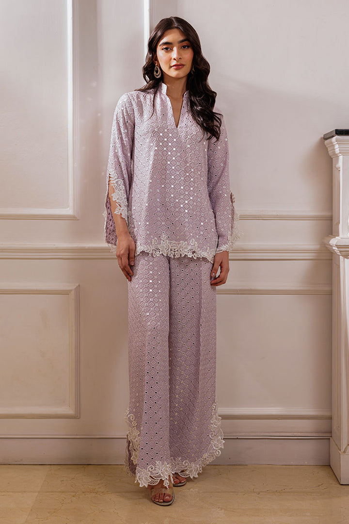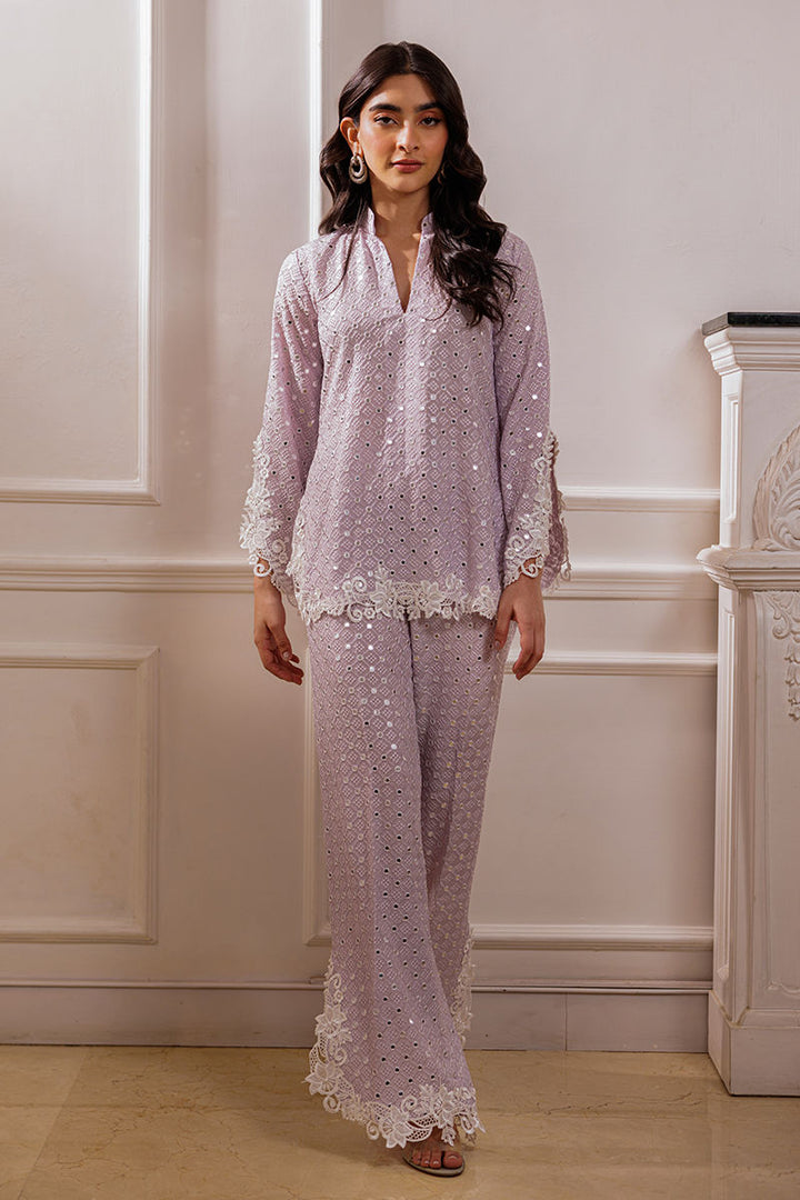 The Paris lavender silk cape features intricate embroidery with foil work, enhanced by 3D floral appliqué details and cutwork borders. It is paired with palazzo pants for a sophisticated, modern look.