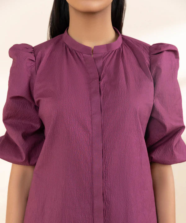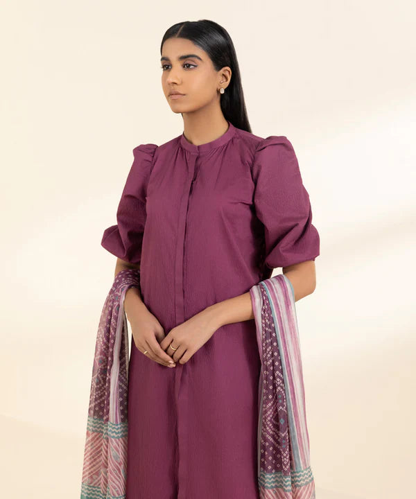 Make a statement with our three-piece ensemble in burgundy featuring a dyed seersucker shirt and trousers paired with a printed blended tissue dupatta.