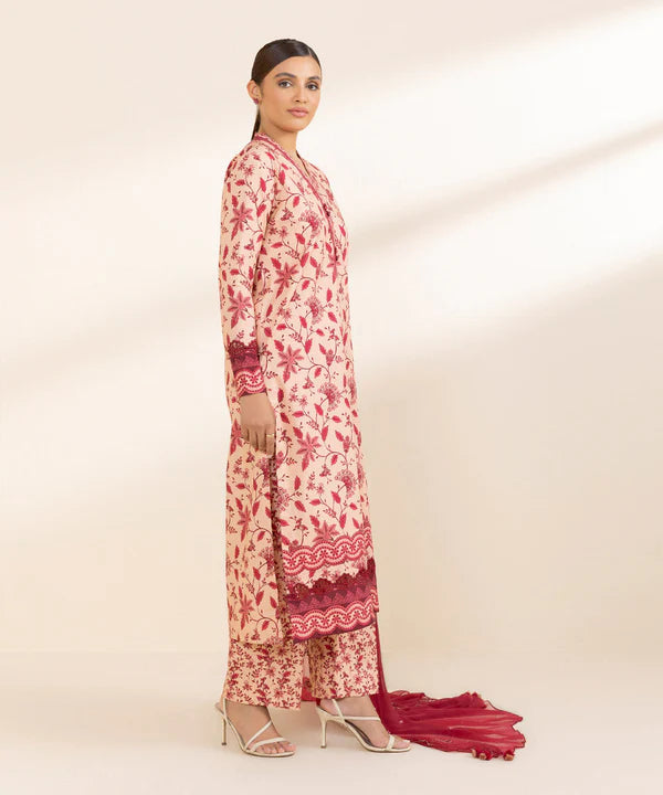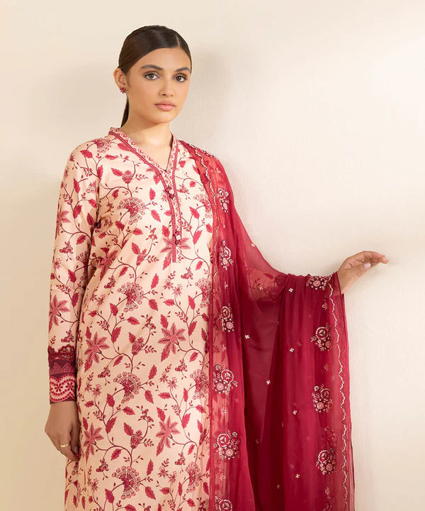 Make a statement with our three-piece embroidered ensemble in pastel coral featuring a cotton shirt and trousers paired with a blended chiffon dupatta in crimson red.