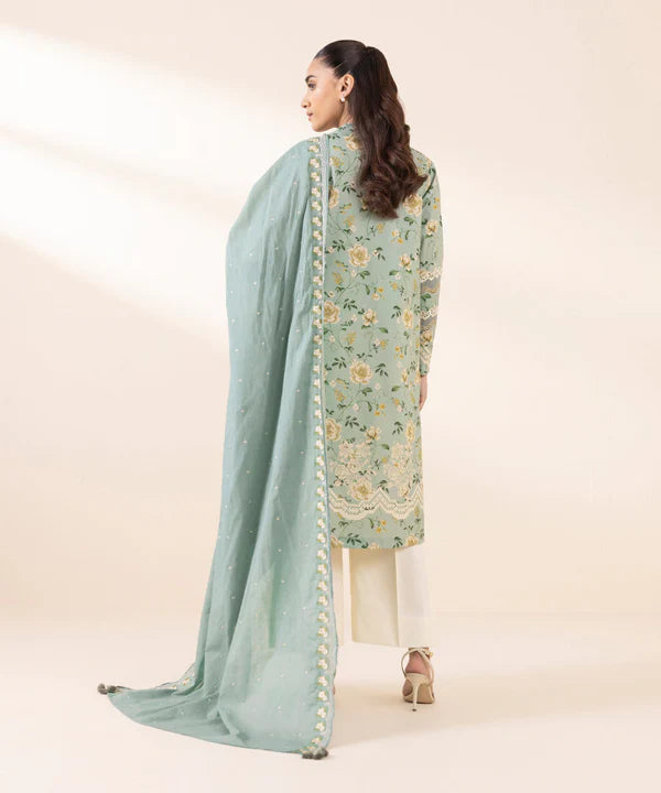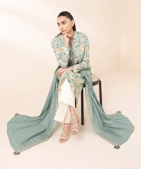Elevate your style with our two-piece ensemble in sea green featuring a cotton shirt paired with a dyed embroidered voile dupatta.
