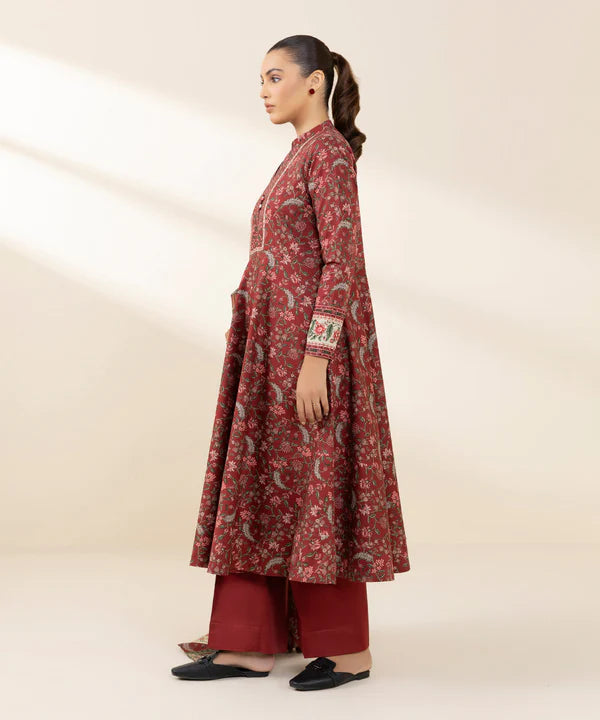 Elevate your style with our three-piece printed ensemble in dark maroon featuring a cotton shirt and trousers paired with a voile dupatta.