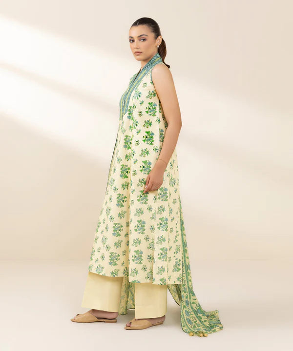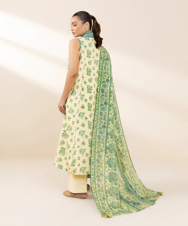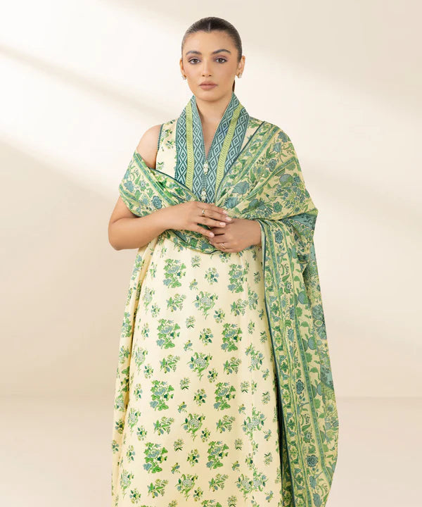 Elevate your style with our three-piece printed ensemble in off white featuring a cotton shirt and trousers paired with a voile dupatta.