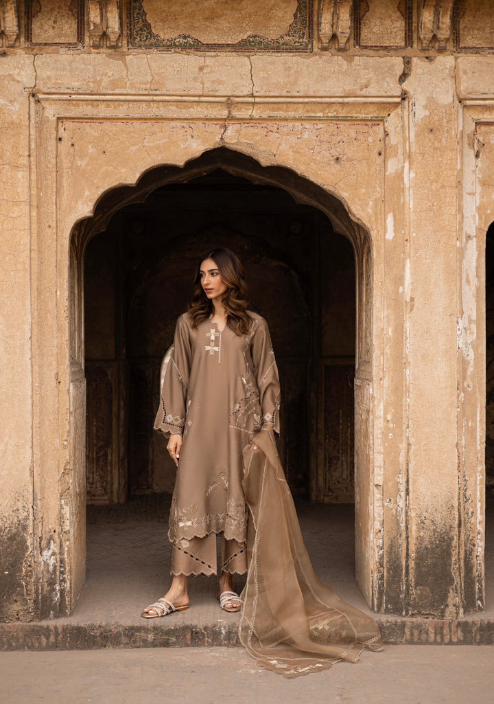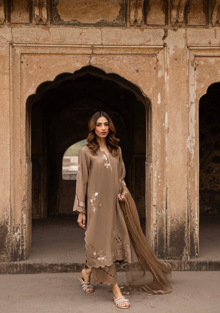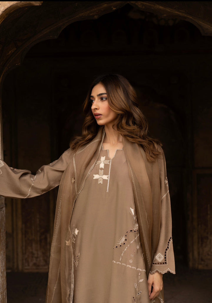 Embroidered Mocha Set Includes an embroidered shirt and culottes Fabric - Pure Khaddi Silk Embroidered Organza