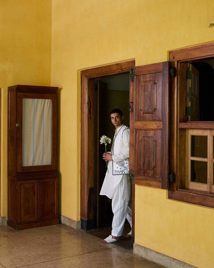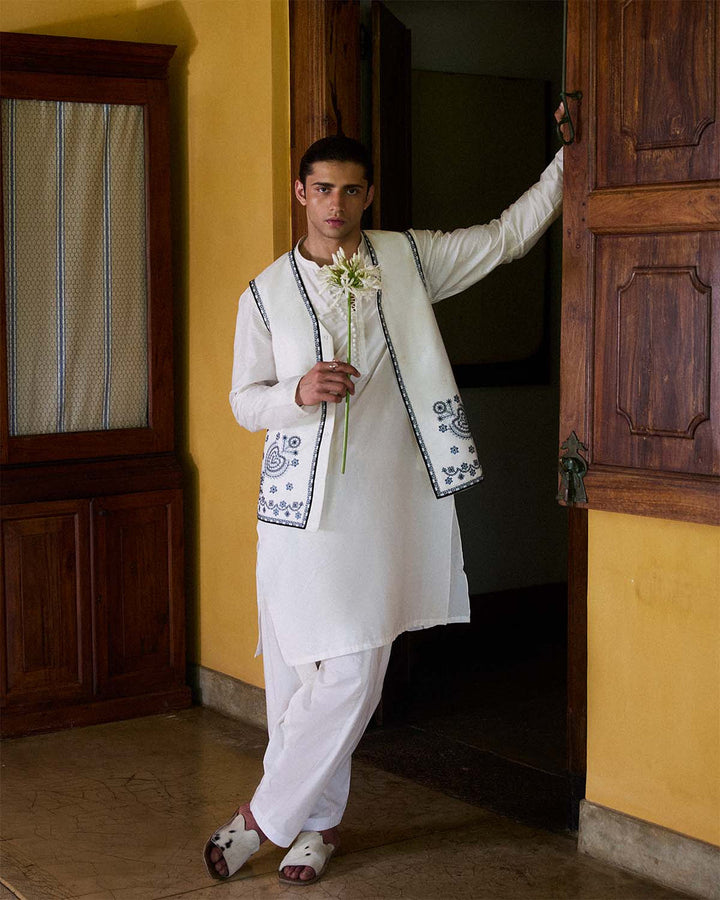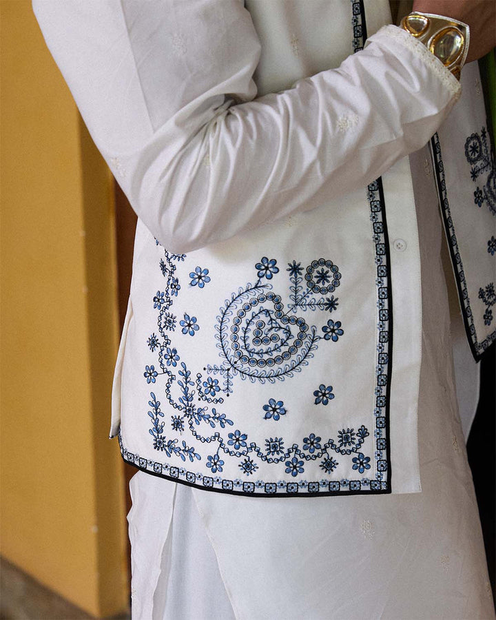 Description: A timeless expression of sophistication, this ensemble features intricate monochrome embroidery on a refined ivory canvas. The ivory waistcoat is adorned with delicate, tonal embroidery, adding depth and texture to its structured silhouette. Designed for effortless elegance, it pairs seamlessly with the matching ivory shirt, which mirrors the same exquisite embroidery for a harmonious look. Completing the ensemble is a plain ivory shalwar, providing a balanced contrast to the intricately embroidered pieces. Perfect for formal gatherings and cultural celebrations, this outfit embodies grace, tradition, and impeccable craftsmanship.