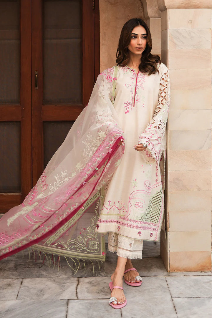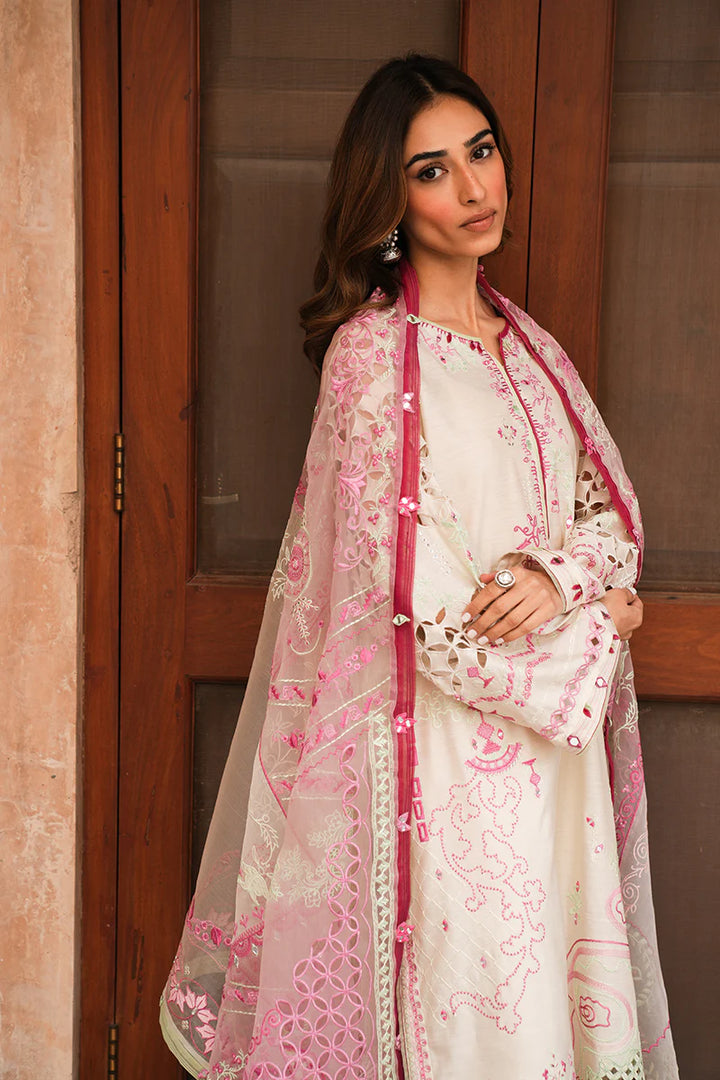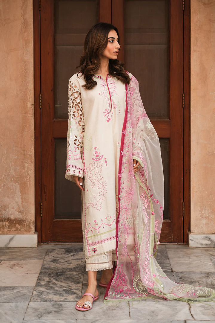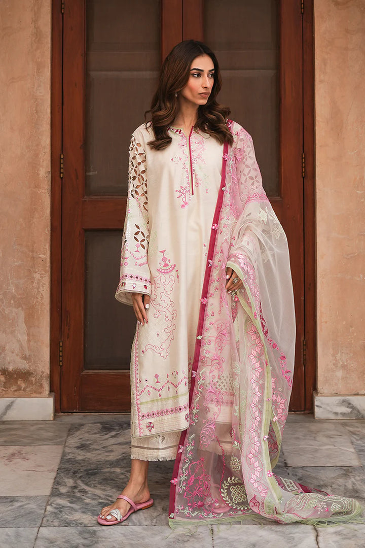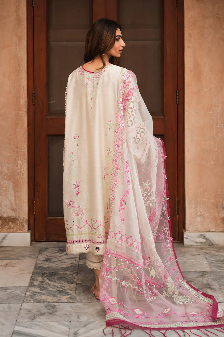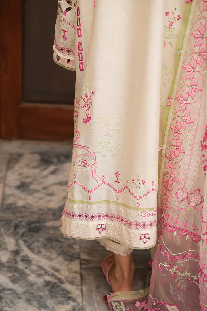 The Noor ensemble is a refined blend of intricate craftsmanship and delicate textures. The khadi silk shirt is adorned with machine embroidery in resham, applique work, cutwork, and mirror detailing. Organza finishing on the neckline and sleeves, along with mirror hangings and pleats, add a graceful touch. The organza dupatta complements the look with applique work, mirror embellishments, and cutwork, finished with pleats, pintucks, shredding, and tassel-adorned mirror hangings.
