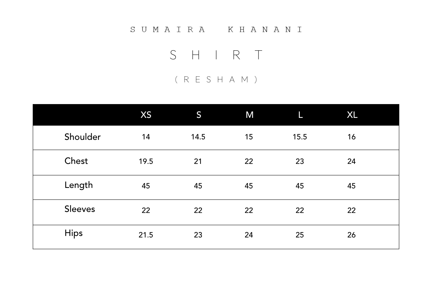Elevating classic craftsmanship, the Resham outfit features a raw silk shirt with intricate machine embroidery in resham, applique work, and delicate scalloped daman with mirror detailing. The organza dupatta is adorned with applique work, mirror accents, and resham embroidery, finished with gotta and shredded edges for a refined touch.