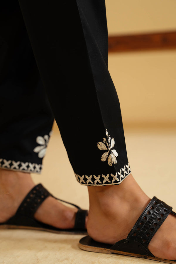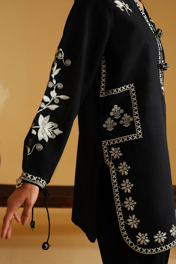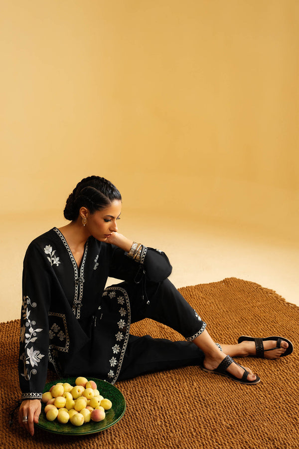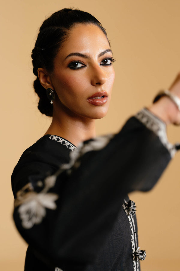 Anchored in obsidian black and adorned with delicate ivory floral embroidery, Meher is a timeless expression of subtle strength and composed elegance.