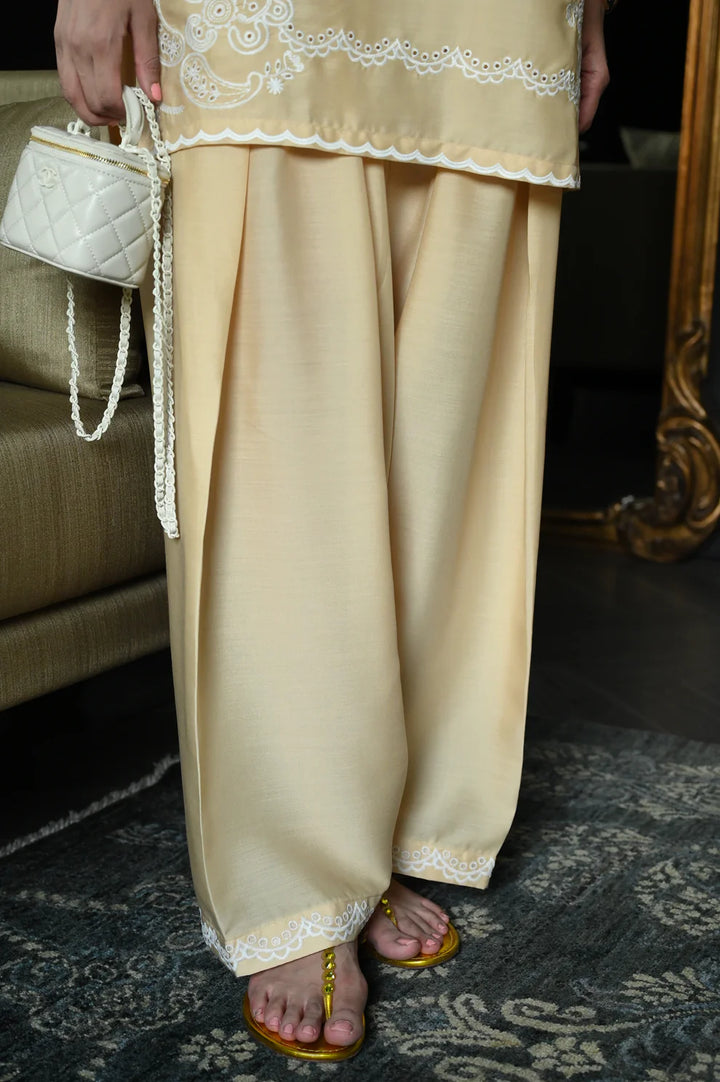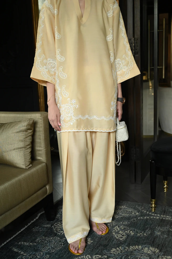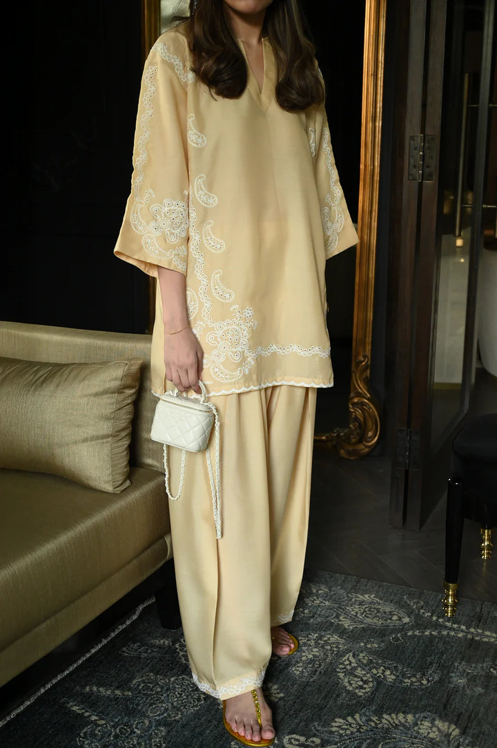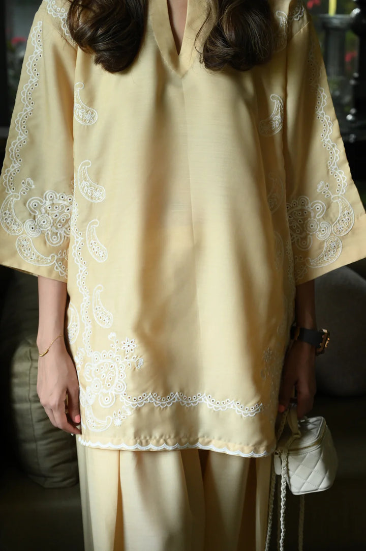 A yellow co-ord set, beautifully adorned with white paisley and floral embroidery along the hem, sleeves, and borders, paired with a shalwar featuring an embroidered hem.