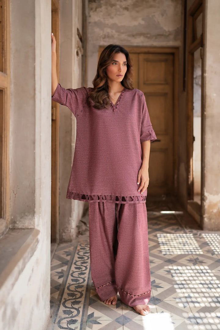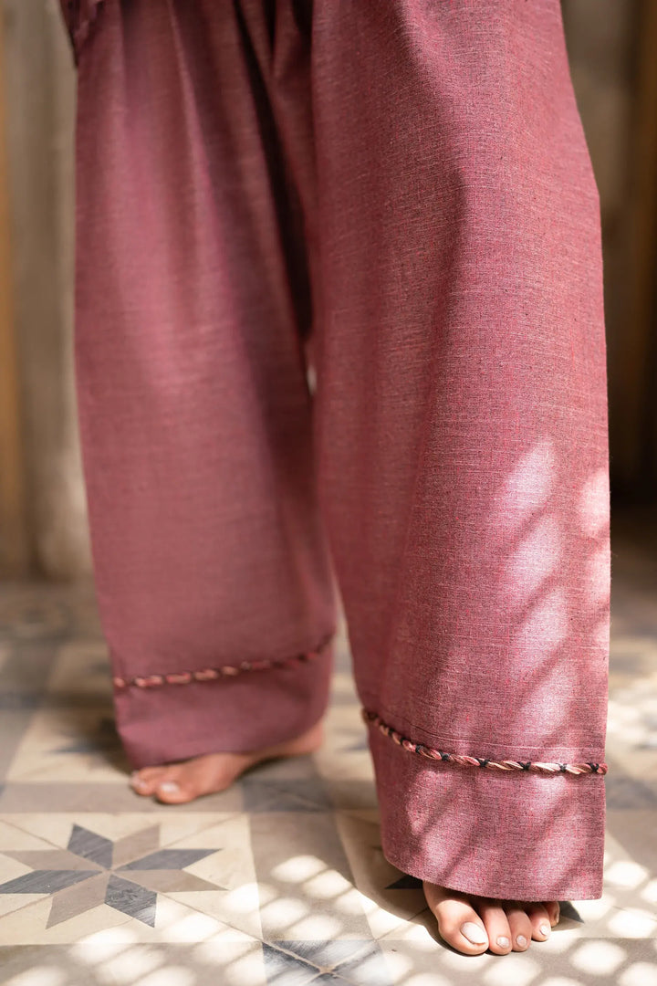 A rich toned co-ord crafted in a textured weave, finished with tonal fabric details along the neckline, hem, and pant cuffs.