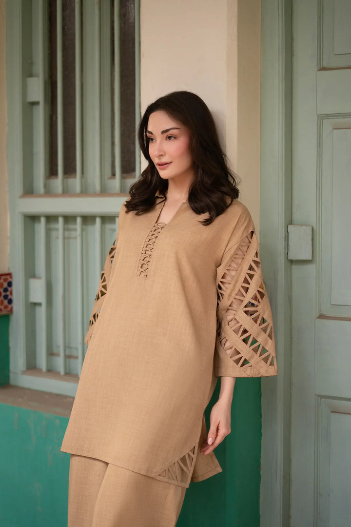 A warm, earthy-toned co-ord set crafted in a rich honey wheat hue. The shirt features bold latticework cutouts on the sleeves and hem, along with a striking lace-up neckline detail that adds depth and character. Paired with wide-leg trousers, this look blends architectural design with easygoing structure—perfect for an elevated everyday ensemble.
