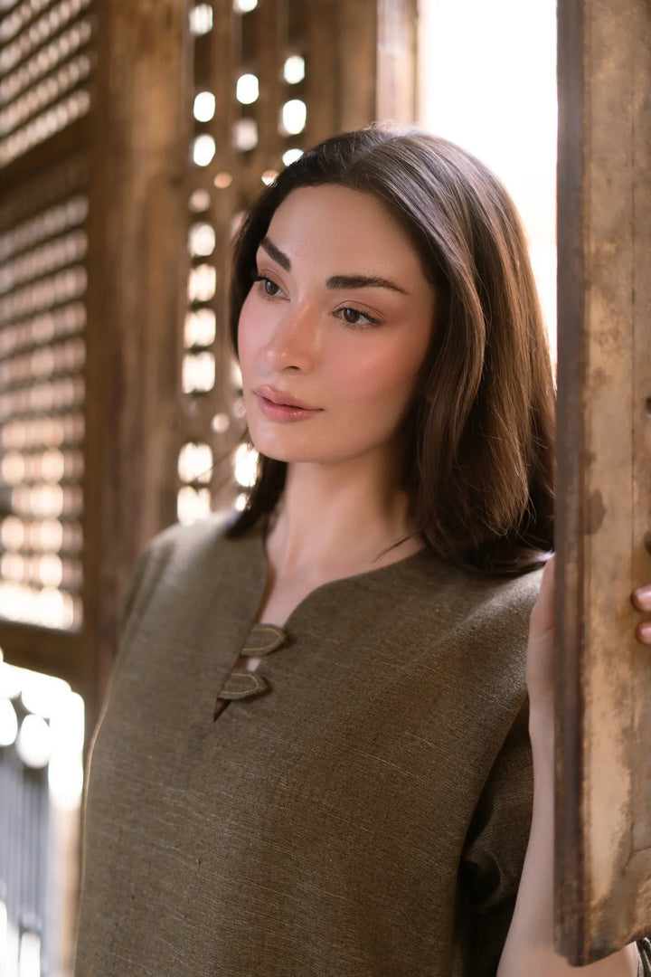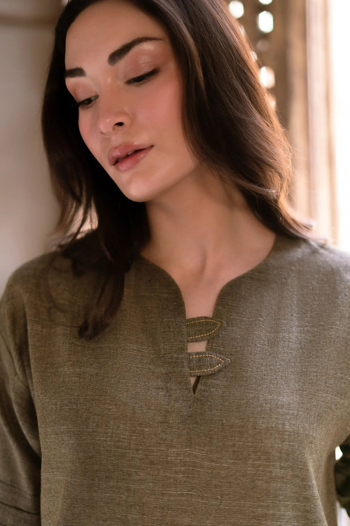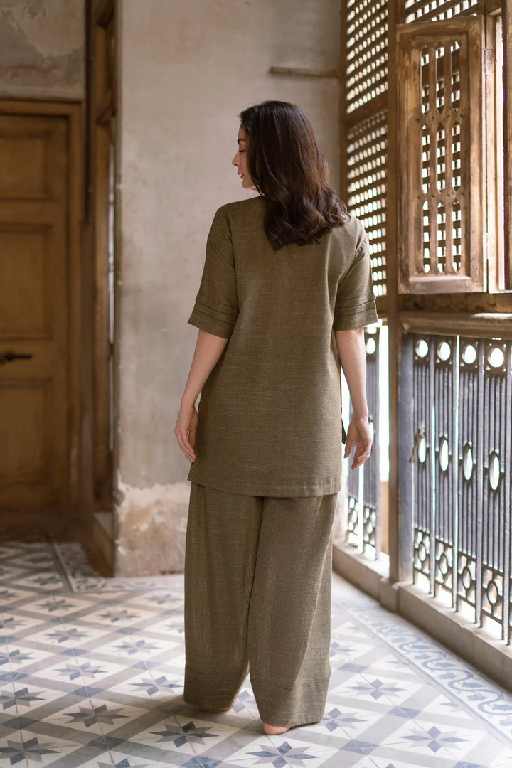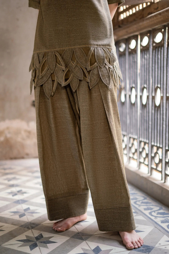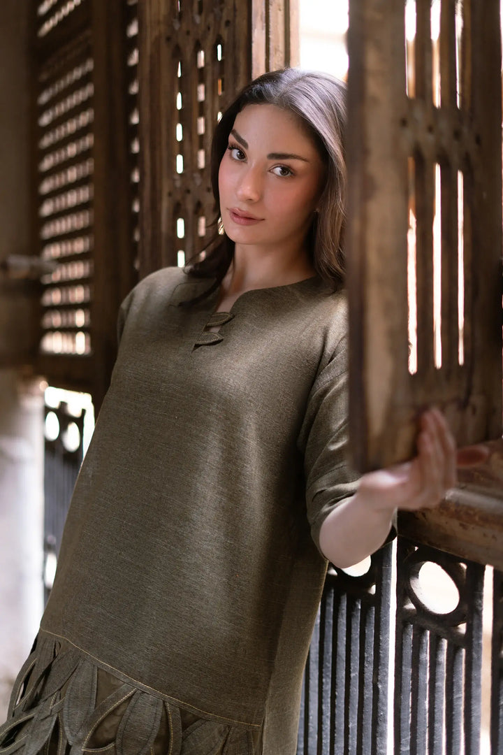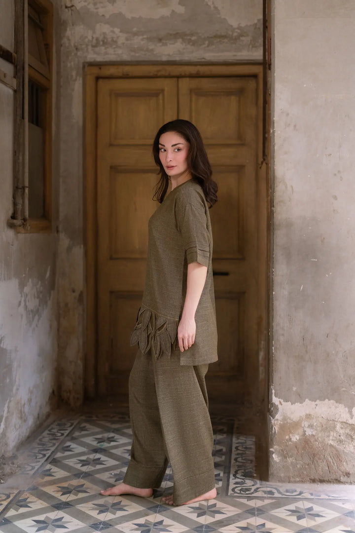 A soft, structured co-ord in an earthy olive tone, featuring a short kurta with signature appliqué leafwork along the hem. Paired with a farshi shalwar for ease and understated elegance.