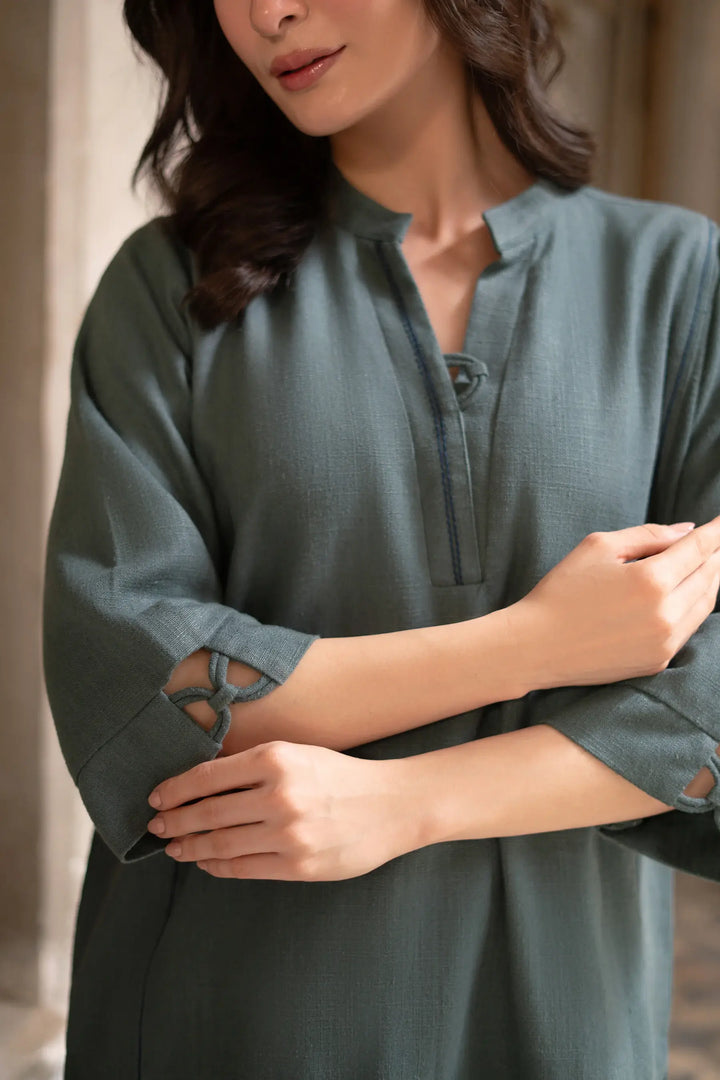 A relaxed cotton co-ord in a warm muted green. The top features a band collar, cuffed sleeves, and cutwork detailing along the hem. Paired with easy, straight-fit pants.