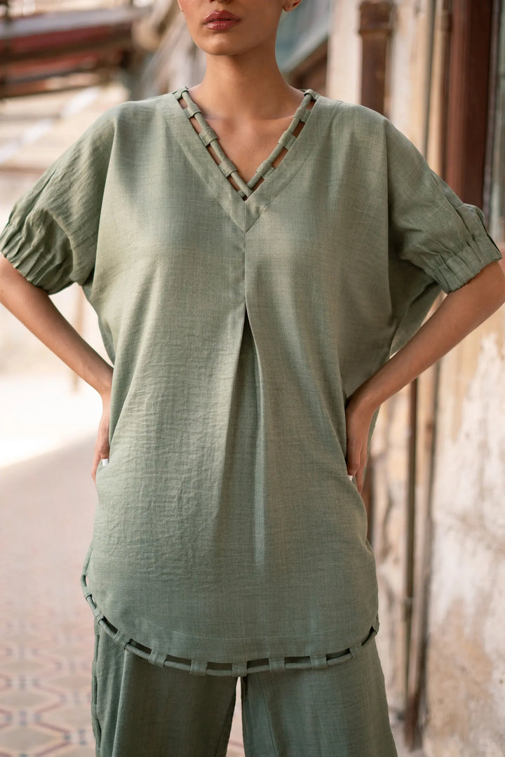 A soft sage green co-ord crafted in a lightweight textured fabric, the Zucchi set features a relaxed V-neck top with looped cutwork along the neckline and hem. Paired with cropped wide-leg trousers, it strikes the perfect balance between ease and understated detailing.