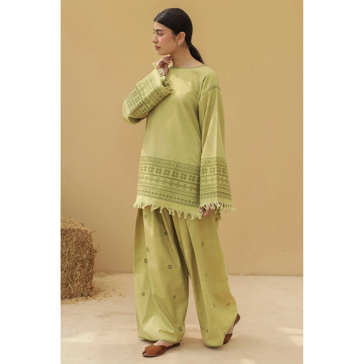 Avocado green sooti khaddar shalwar kameez with monotone cross stitch embroidery.