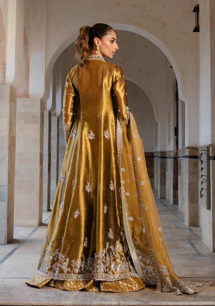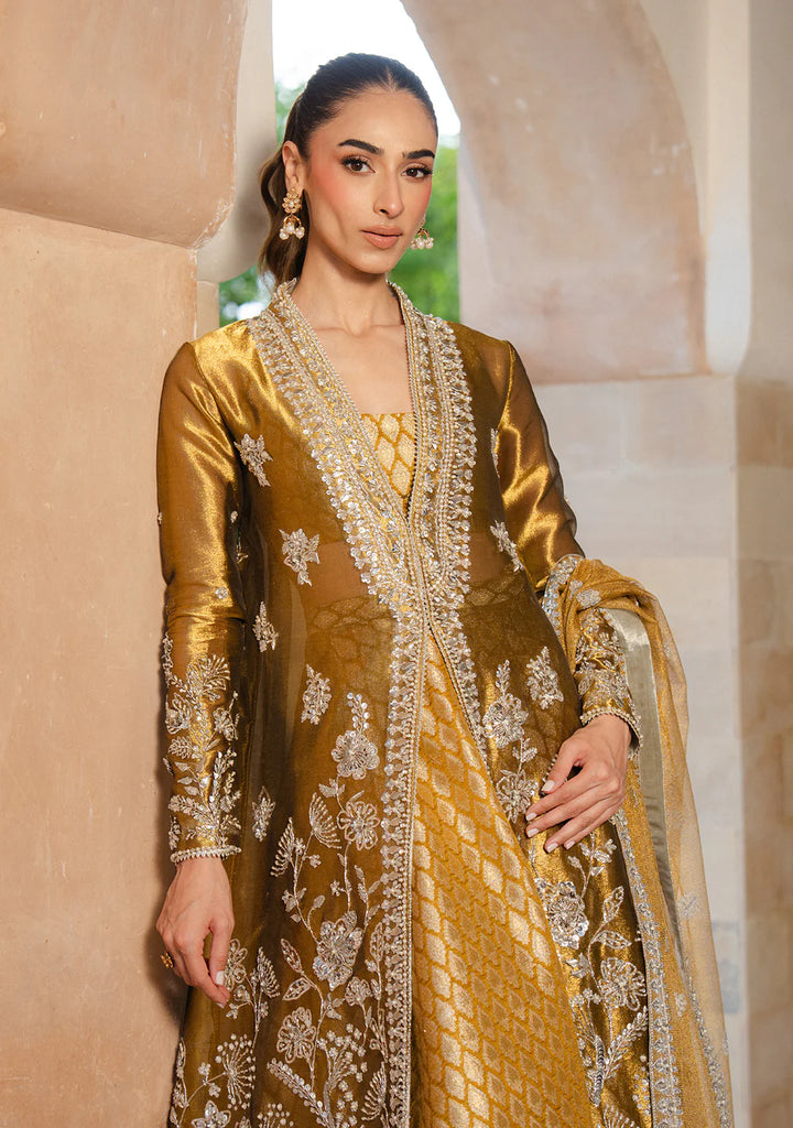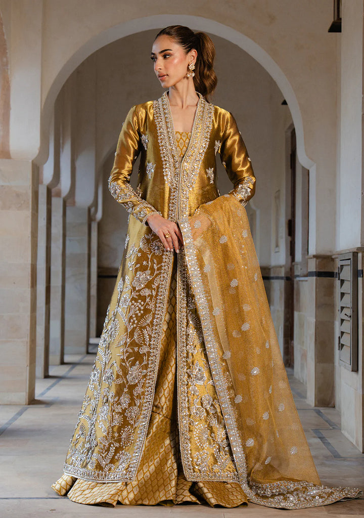 Dinah, the deep gold number comes with a heavily hand-worked jackets with floral motifs. The jacket is paired with our inhouse jamawar bustier and lehnga. The set also comes with a delicately crafted zari net dupatta with silver embroidery and hand-work.