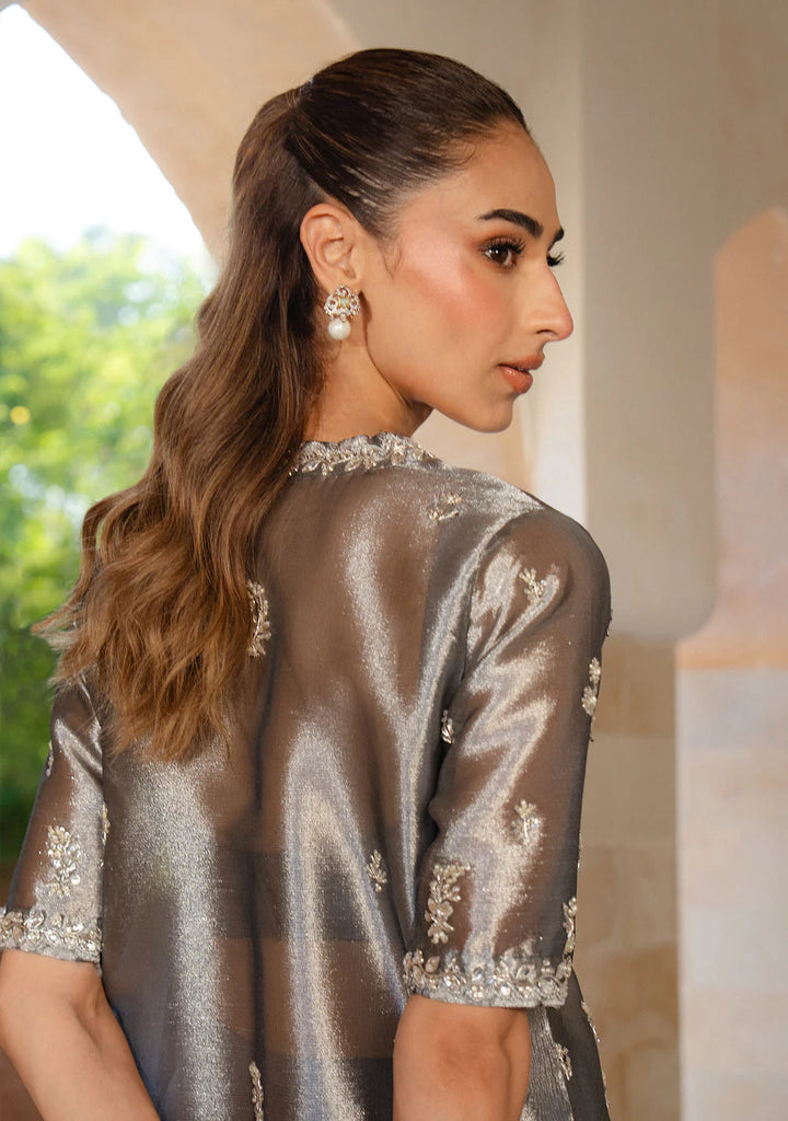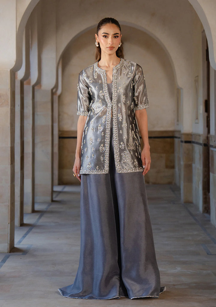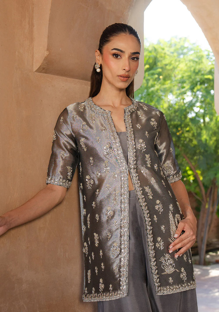 Layana, the metallic silver grey silhouette comes with a fully hand-worked tissue jacket in silver tones. The jacket is paired with a tassel silk bustier and flowy sharara pants.