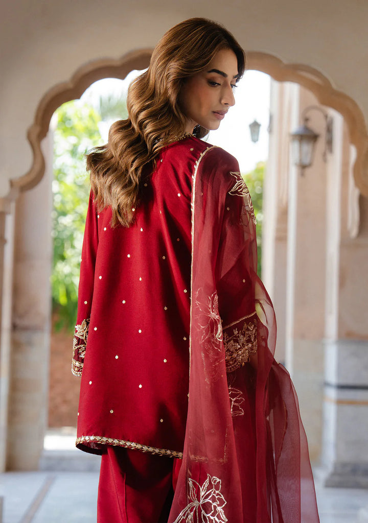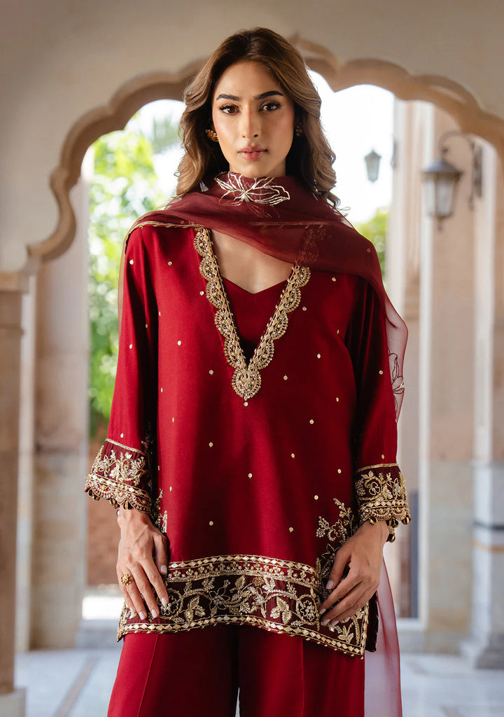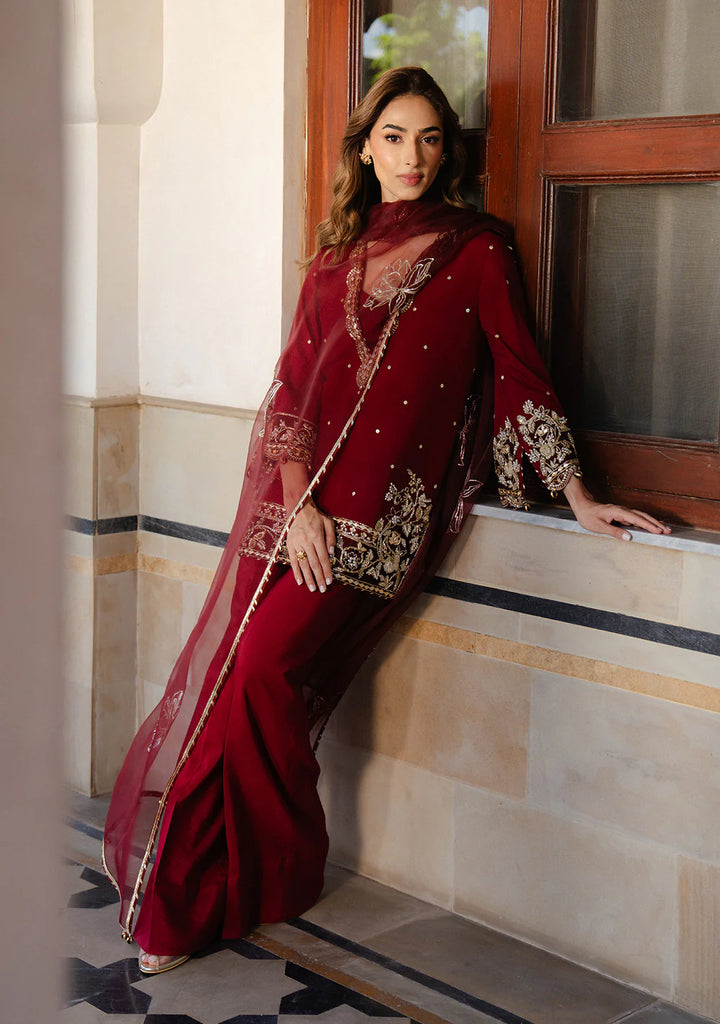 Narine, the maroon short, boxy kurta comes with deeper maroon worked accents on the sleeves and hem. The set hand-worked on khaddi silk comes with straight cut floor length pants and a deeper maroon worked lotus dupatta.