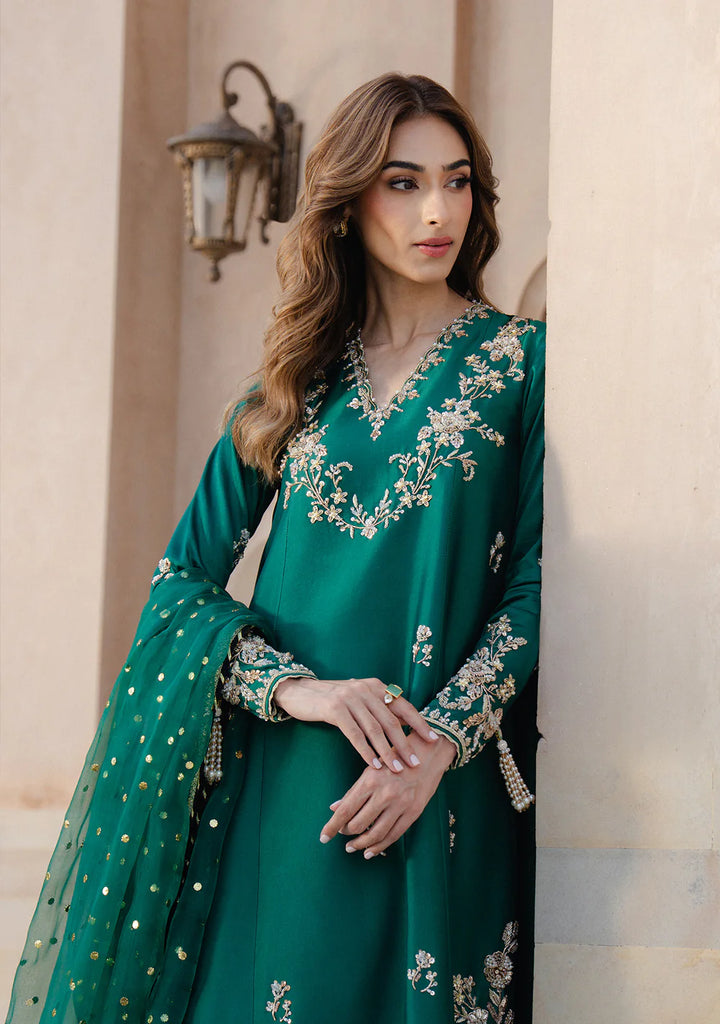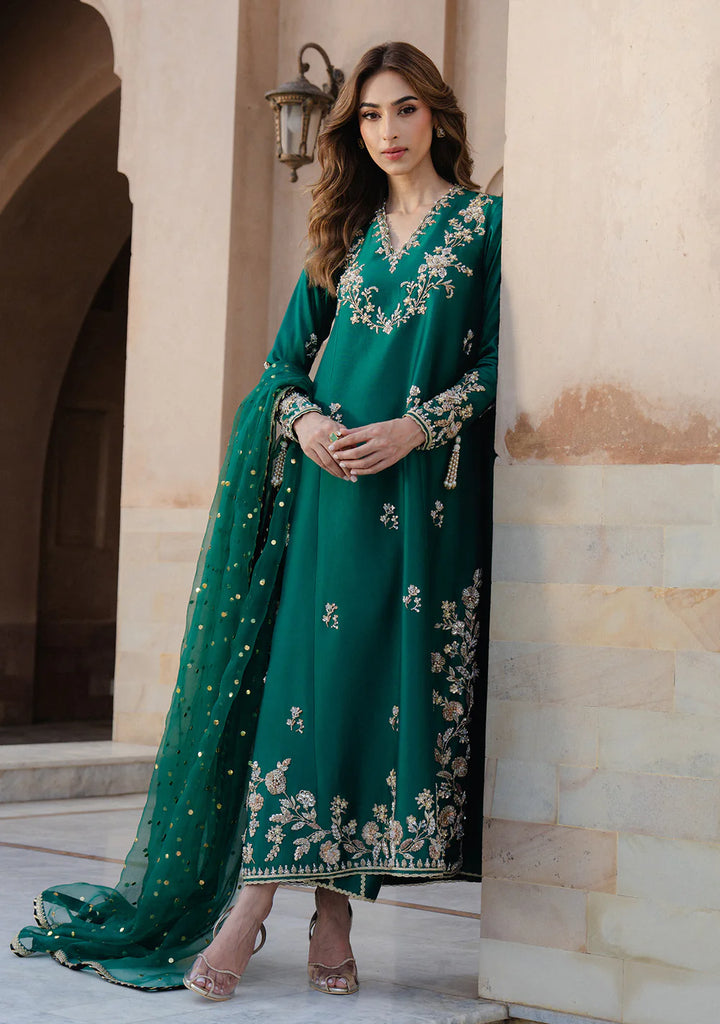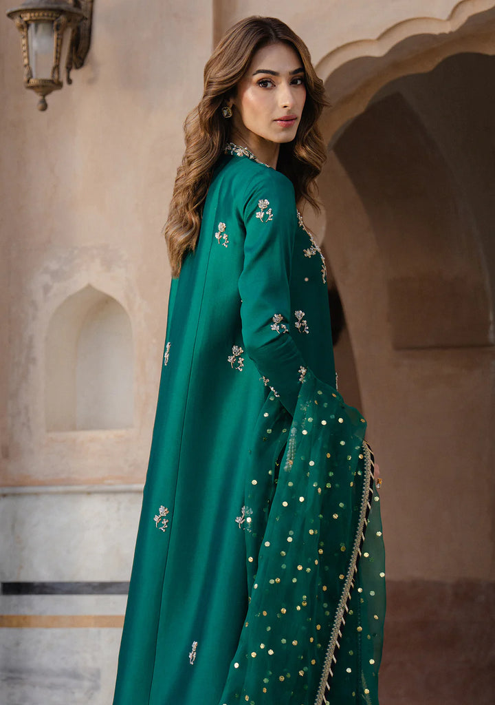 Naz, the rich emerald sheesha silk set comes with a classic princess paneled shirt with gold and silver hand-work. It is paired with an izaar with gold detailing and an organza mukaish dupatta with black accents.