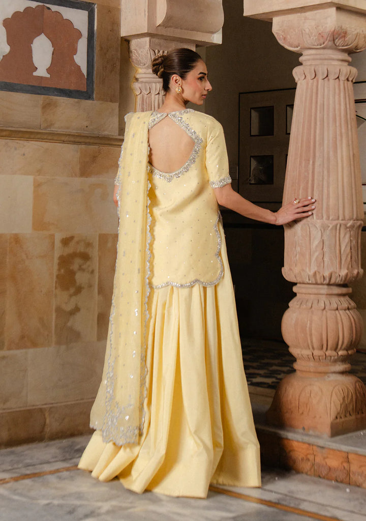 Seren, the pale yellow delicate short scalloped shirt comes in khadi silk with hand-work in shades of silver. It is paired with a coordinating lehnga, cotton net dupatta with silver sequin and hand-work with scalloped edges.