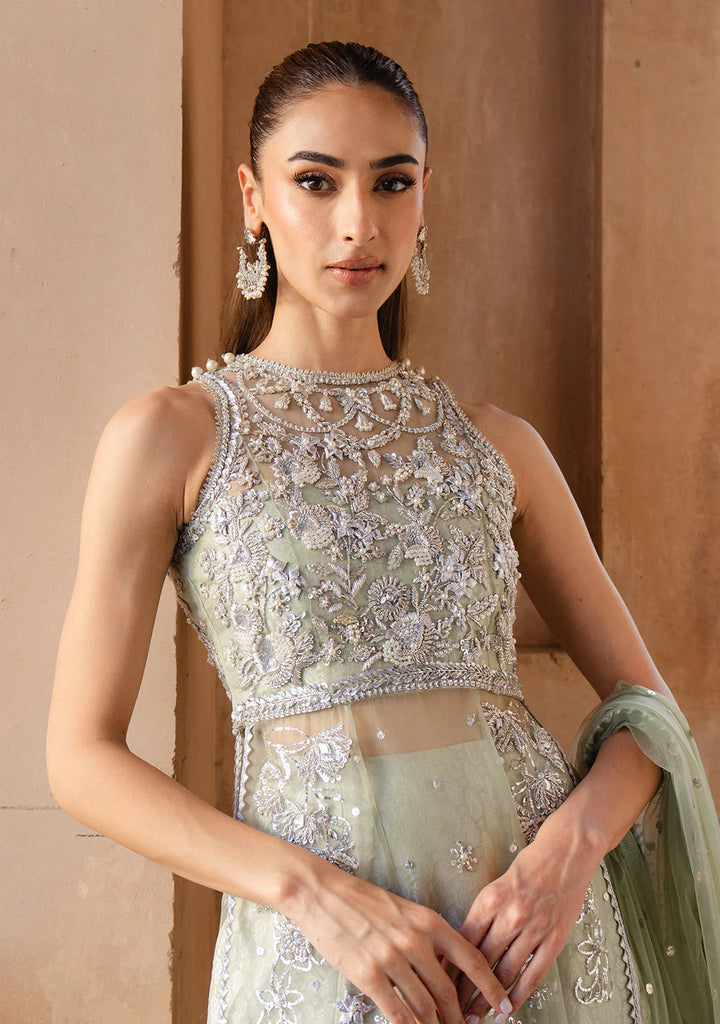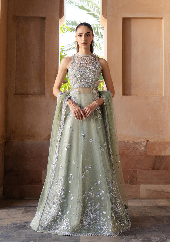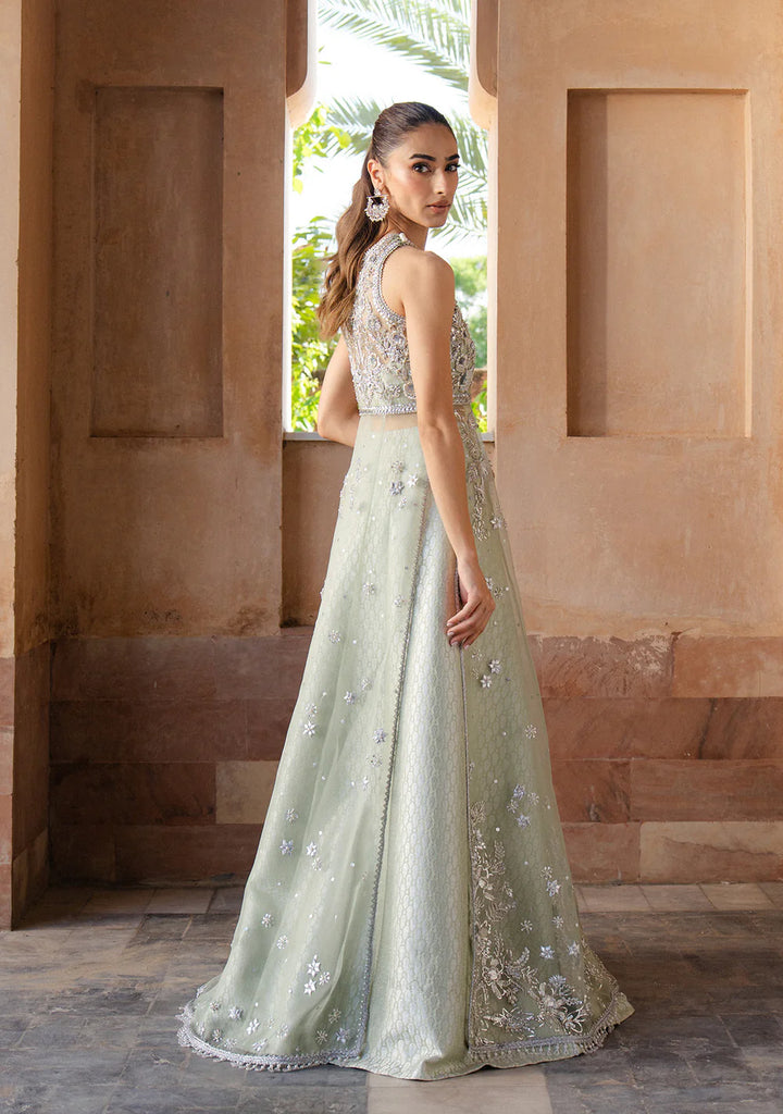 Zaharia, the sage green ensemble comes with a heavily hand-worked bodice, high slits with a paneled flare in front and back. The shirt is paired with our inhouse jamawar silk and a mukaish net dupatta with silver accents.