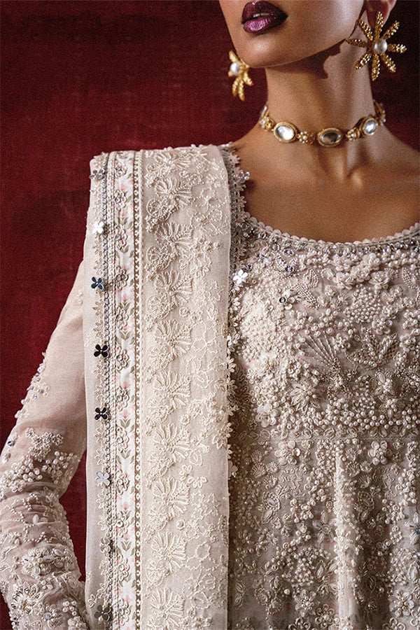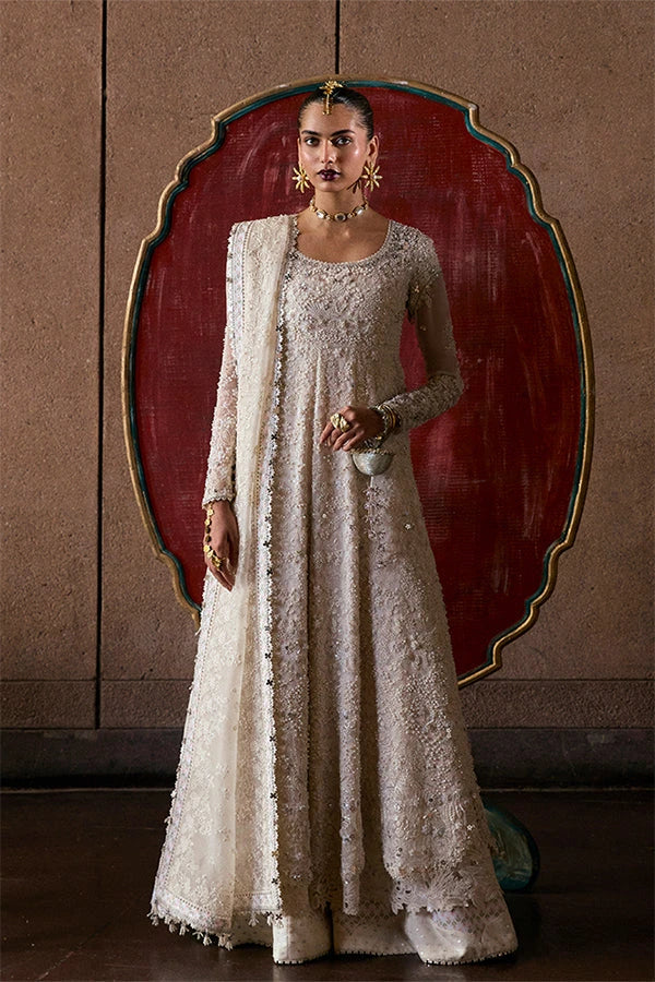 - A white organza pishwaas with scoop neckline, fitted cap sleeves, self-embroidery with beads, mirrors, and pearls, scalloped hem, tasselled back, and layered cutwork finish.