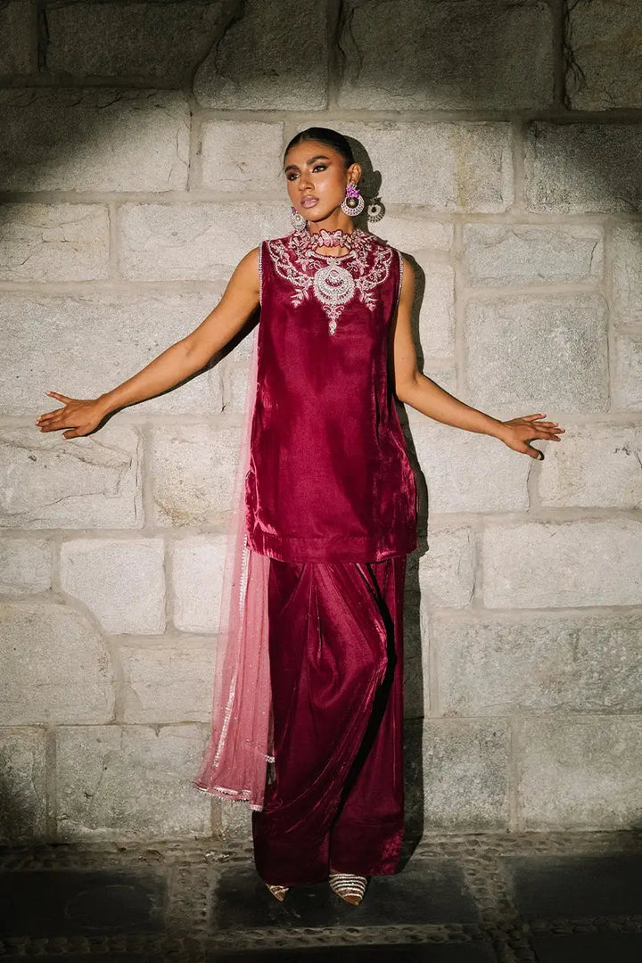 The rich pomegranate pink hue and the scrumptious embrace of velvet takes center stage in this short shirt and trendsetting farshi shalwar! The elegance is amplified with masterfully embroidered zardozi and resham work along the neckline. Paired with a pastel-hued choker dupatta, say hello to a refined take on South Asian festive wear!