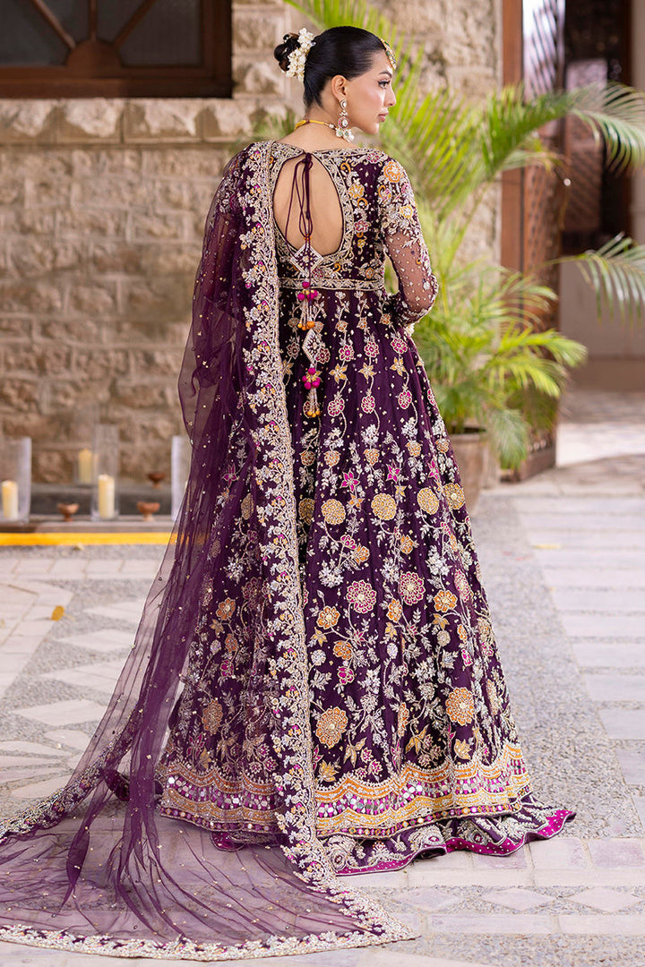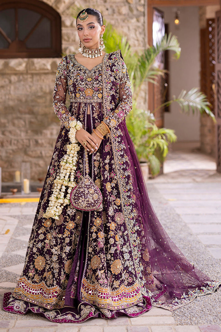 A regal mehendi bridal in rich purple, this ensemble is a celebration of craft and color. The stiff net kalidar features an open front silhouette with fitted sleeves and a graceful sweetheart neckline, adorned with vibrant magenta, rust, and mustard sheesha silk appliqué flowers scattered across the body. Each panel is meticulously detailed with nakshi, sequins, cutdana, moti, dabka, resham, and tiki stones, creating a delicate play of texture and shimmer. Paired with it is a sheesha silk lehenga, its hemline enriched with magenta appliqué work that adds depth and vibrance to the look. Completing the ensemble is a stiff net dupatta, finished with an intricate cutwork border highlighted with pops of appliqué hues, lending a perfect balance of tradition and modern artistry.