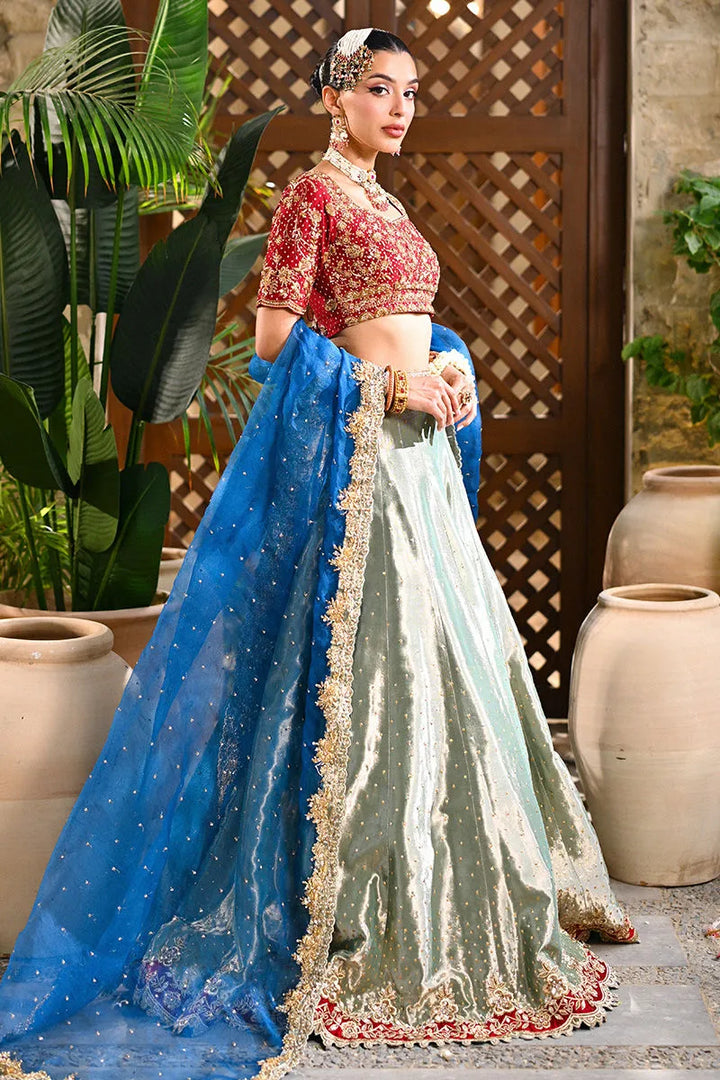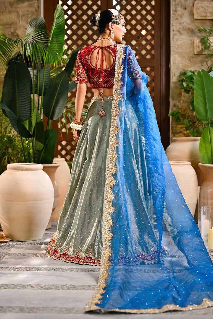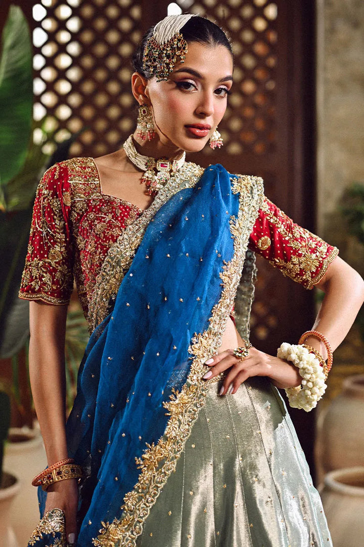 A striking lehenga choli set that plays with bold contrasts and timeless craftsmanship. The deep red raw silk choli, adorned with floral motifs, short sleeves, and intricate handwork in dabka, zardozi, and nakshi, sets a regal tone. It is paired with a refreshing mint lame lehenga featuring an appliquéd scalloped border, delicate sequins, and a sequined belt detail that adds structure and shimmer. Completing the ensemble is a royal blue net oraganzadupatta, elevated with hand-embellished borders and scattered sequins, tying together the palette in a perfect balance of vibrance and elegance
