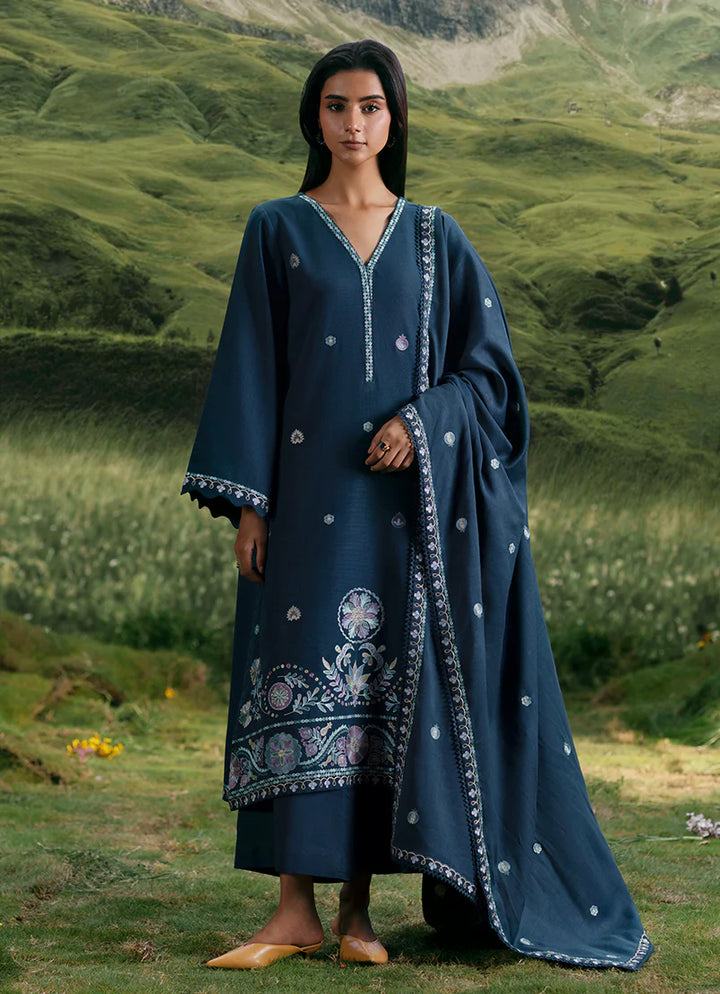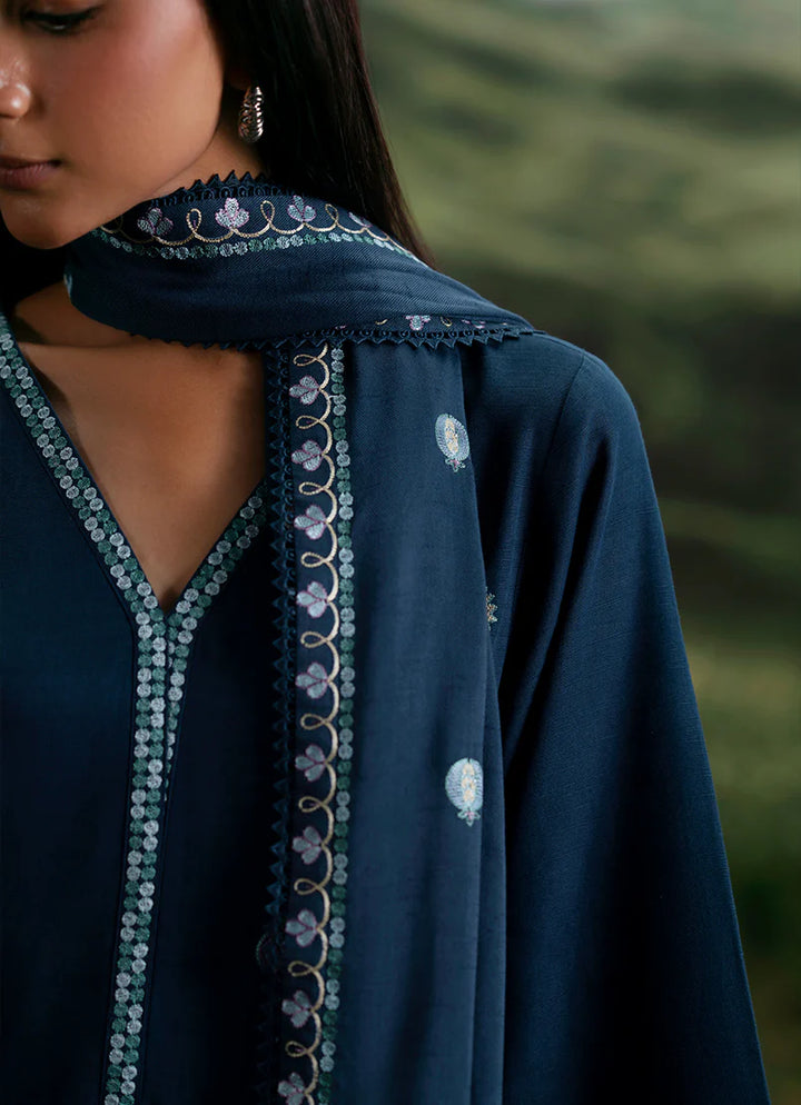 Samira in Navy Blue from our Winterkari '25 Collection. An embroidered khaddar 3pc unstitched outfit paired with khaddar trousers & an acrylic shawl.