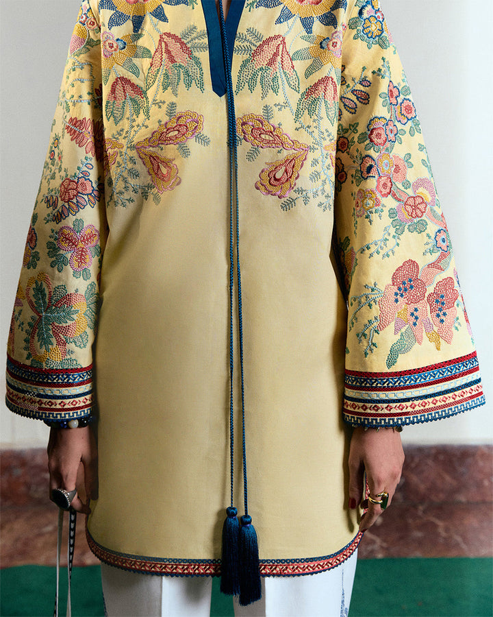 Description: This light yellow ensemble brings together soft tones and playful craftsmanship. The short shirt is embroidered with multicolor floral motifs, brought to life with delicate tassels that add movement and charm. Bell sleeves echo the same vibrant threadwork, creating a sense of balance and flow. It’s paired with ivory culottes, detailed in fine monochrome embroidery for a subtle contrast. A digitally printed chiffon dupatta adds a whisper of print and lightness, completing the look with a fresh, airy finish.