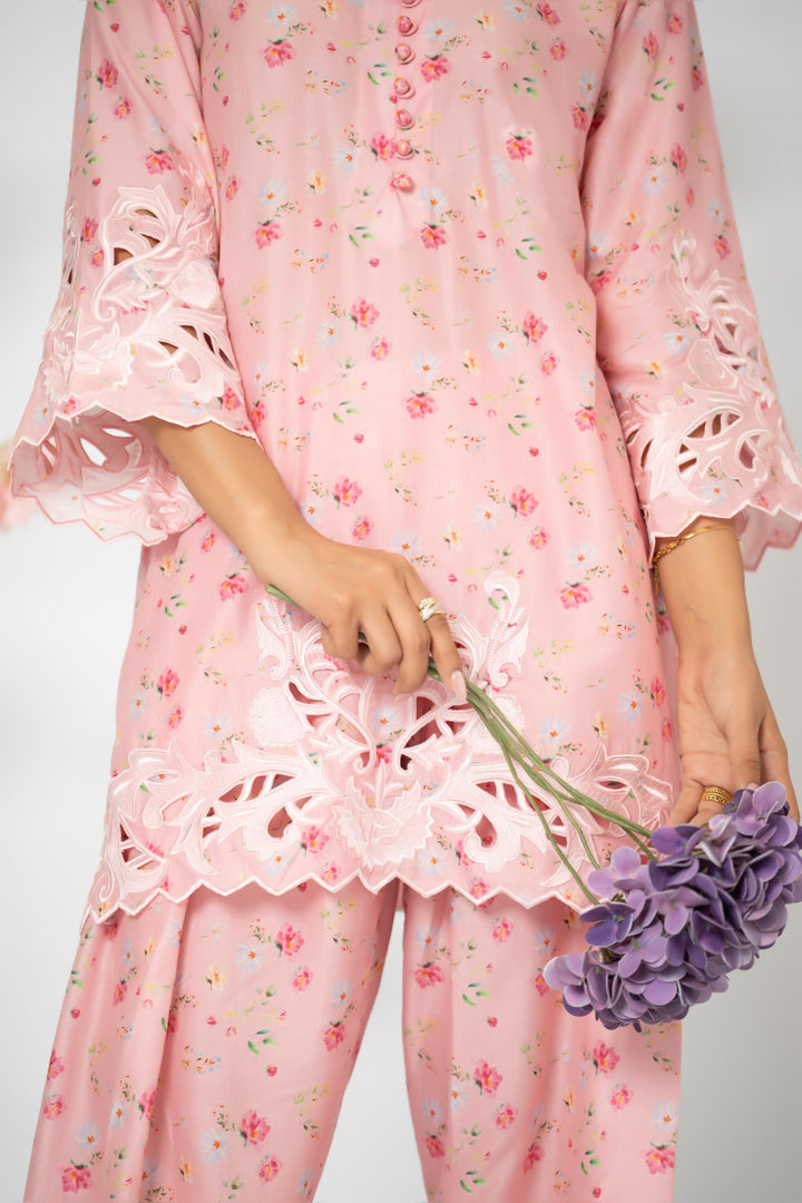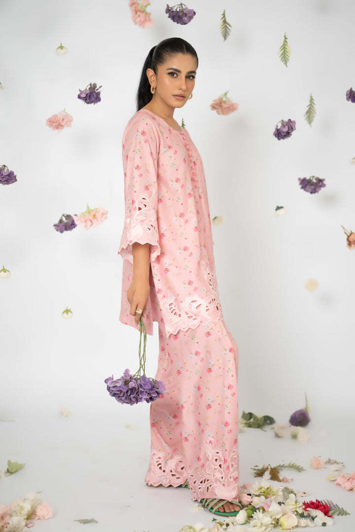 A coordinated pure lawn printed set adorned with refined cutwork embroidery at the sleeve edges, shirt hemline, and shalwar hems—bringing subtle elegance to everyday wear.