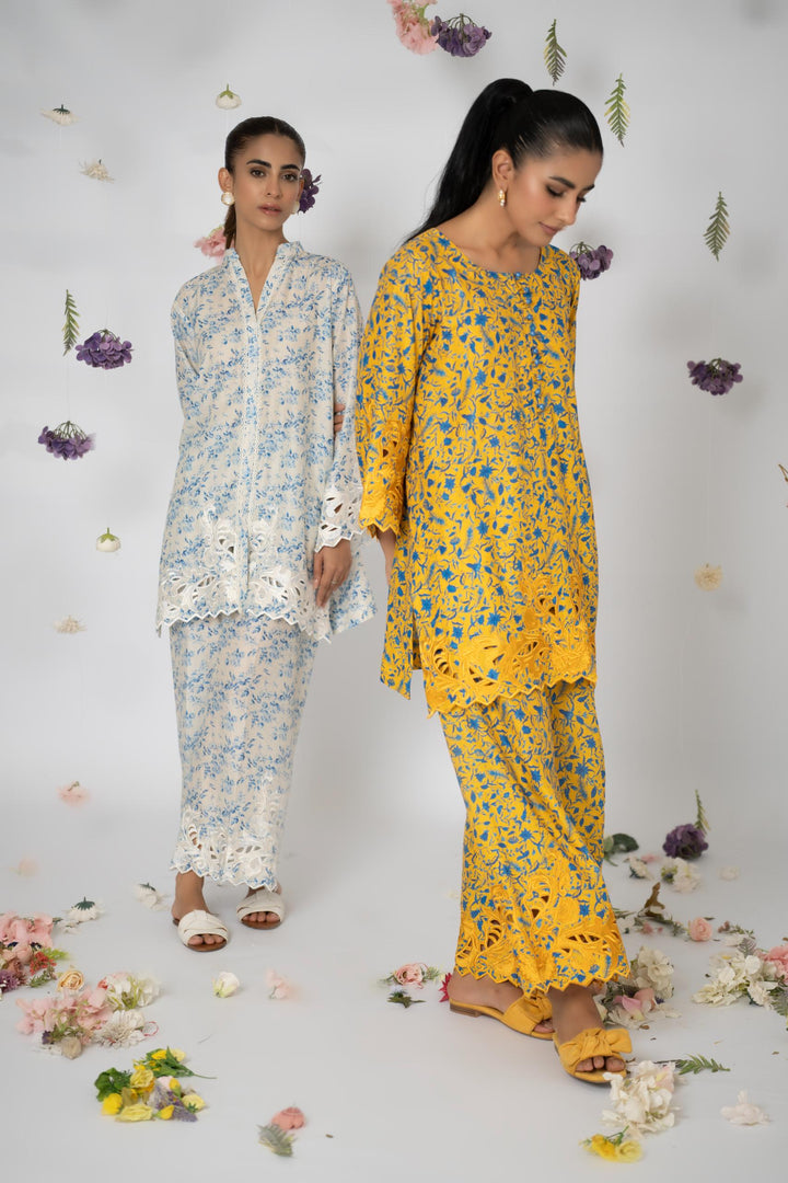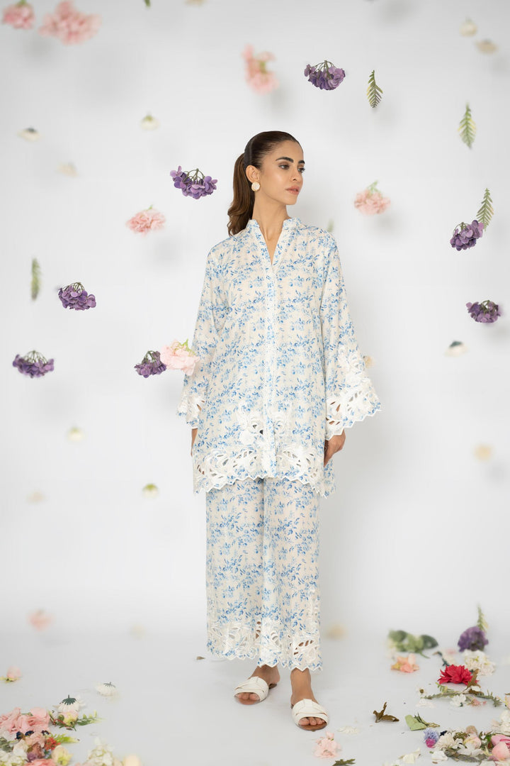 A coordinated printed set adorned with refined cutwork embroidery at the sleeve edges, shirt hemline, and culotte hems—bringing subtle elegance to everyday wear.
