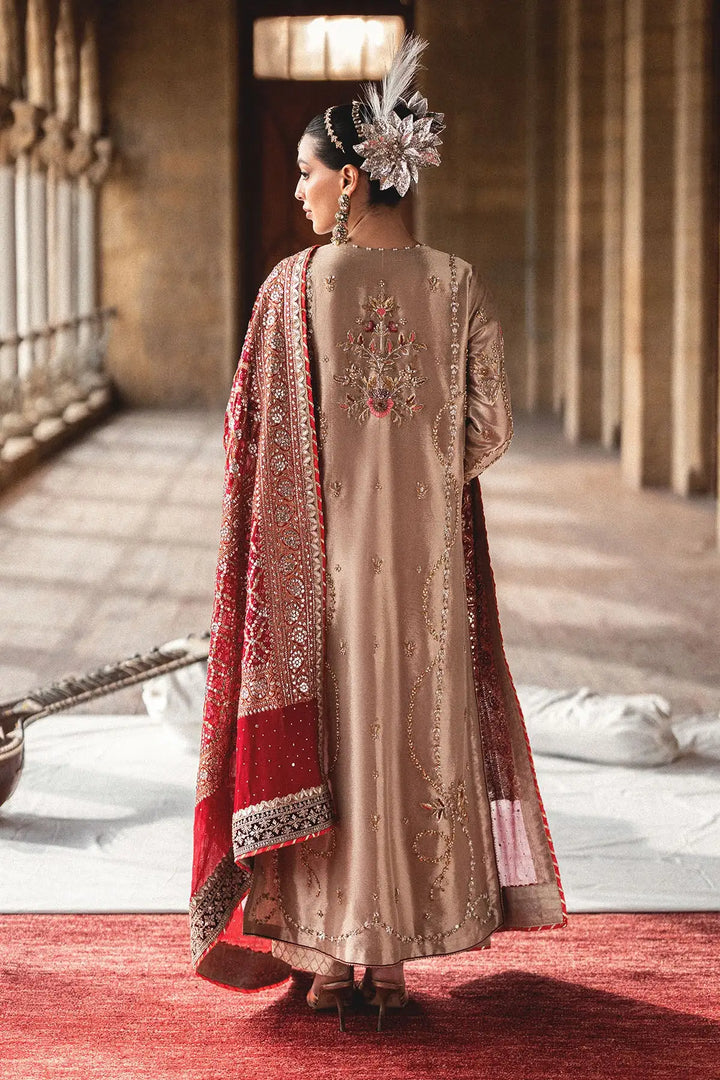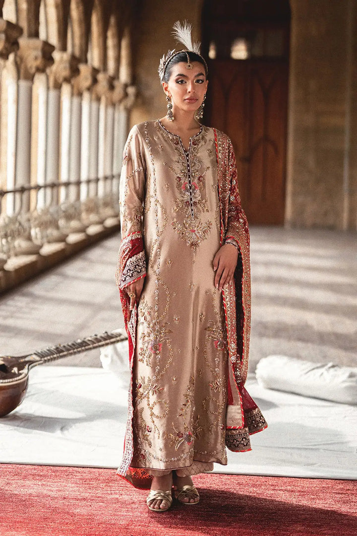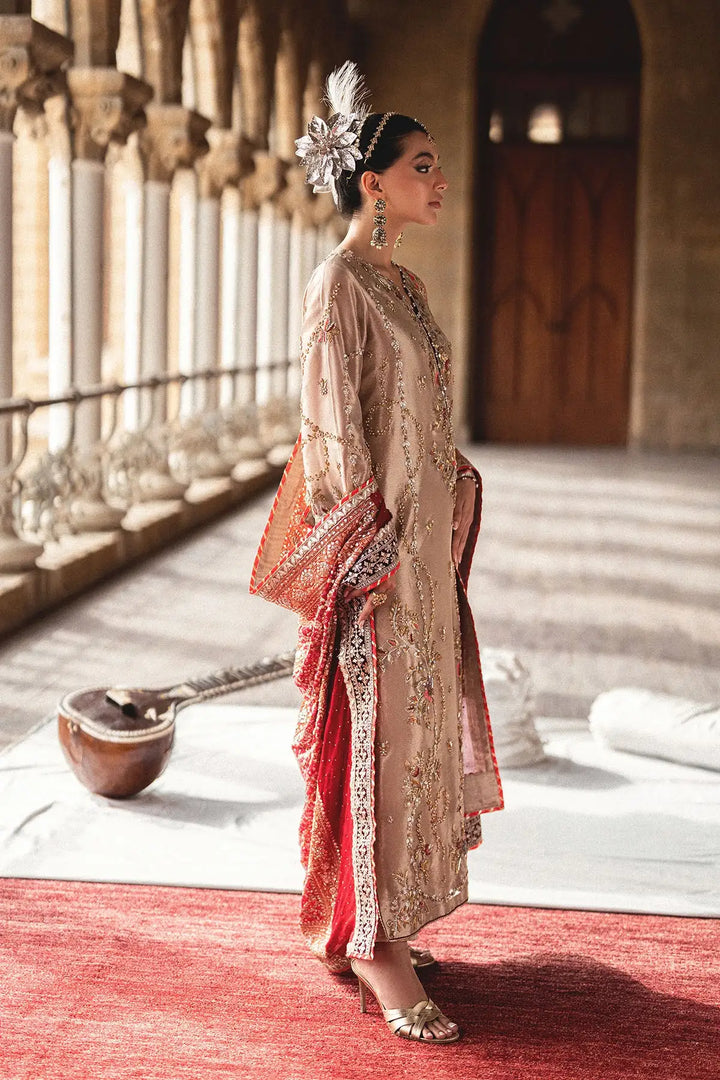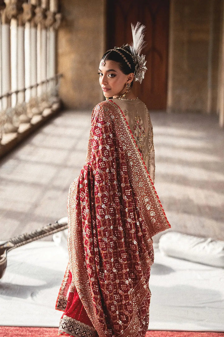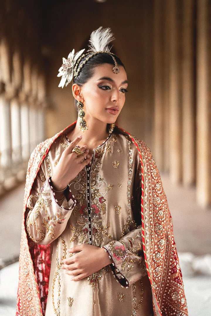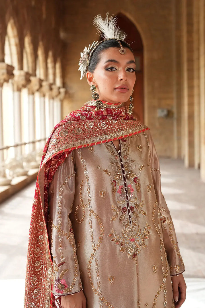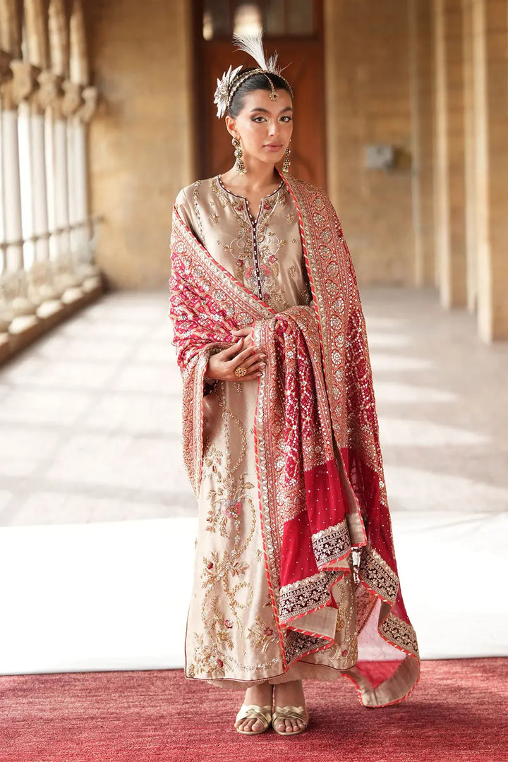Step into elegance with our Golden long shirt. Crafted from pure tissue, this classic piece features intricate gold and silver dabka and cora handwork, creating a truly rich and traditional look. The ensemble is beautifully completed with a Kamdani chunri, which adds a delicate shimmer and a touch of heritage sophistication.