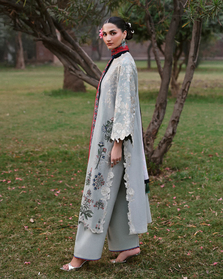 This graceful ensemble features a monochrome floral-embroidered shirt with matching embroidered sleeves that exude refined sophistication. The daaman stands out with intricate multicolor floral embroidery, adding a vibrant contrast to the subtle base. Paired with a dyed trouser and a beautifully printed wool shawl, the outfit blends classic elegance and timeless craftsmanship with a touch of contemporary charm.