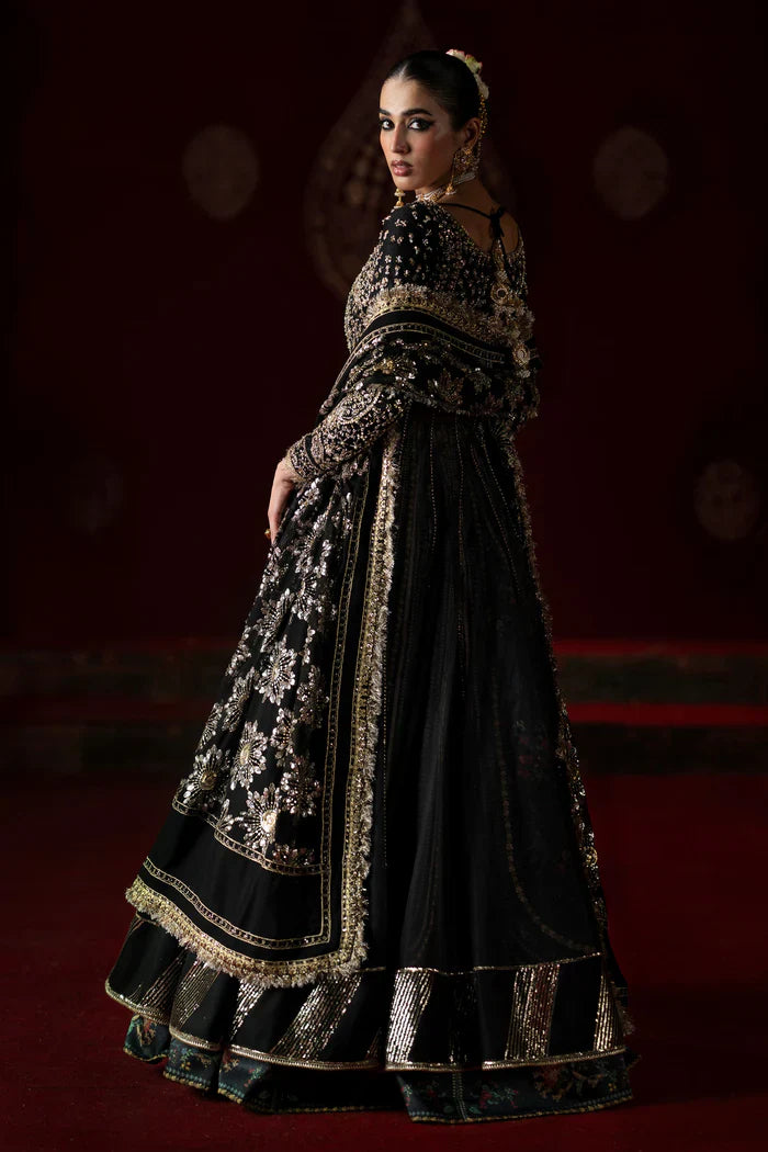 A timeless black pishwas adorned with intricate handwork on the bodice, paired with a classic printed lehenga. The look is elevated with a heavily sequined dupatta, exuding old-world heritage charm with an everlasting grace.