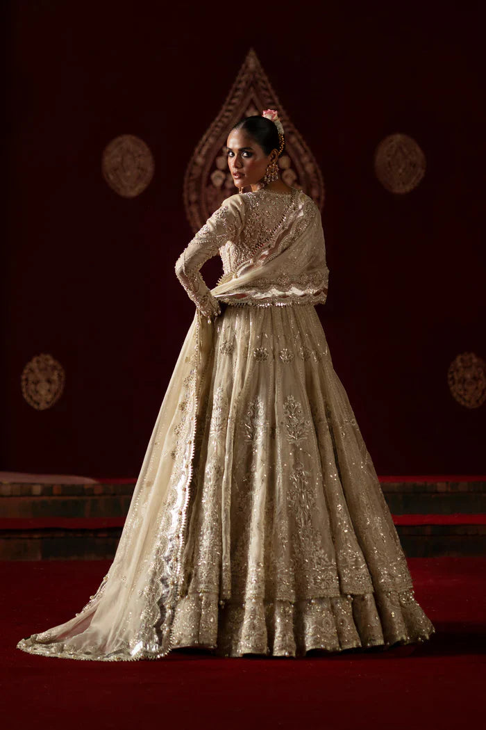 An opulent gold chanderi net tissue double-layered pishwas, adorned with intricate embroidery and delicate handwork details that exude timeless elegance. Paired with a regal jamawar lehnga and a graceful chanderi net dupatta, this ensemble is a perfect blend of tradition and luxury.