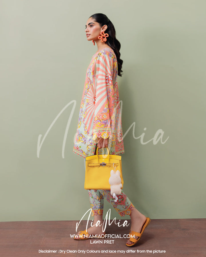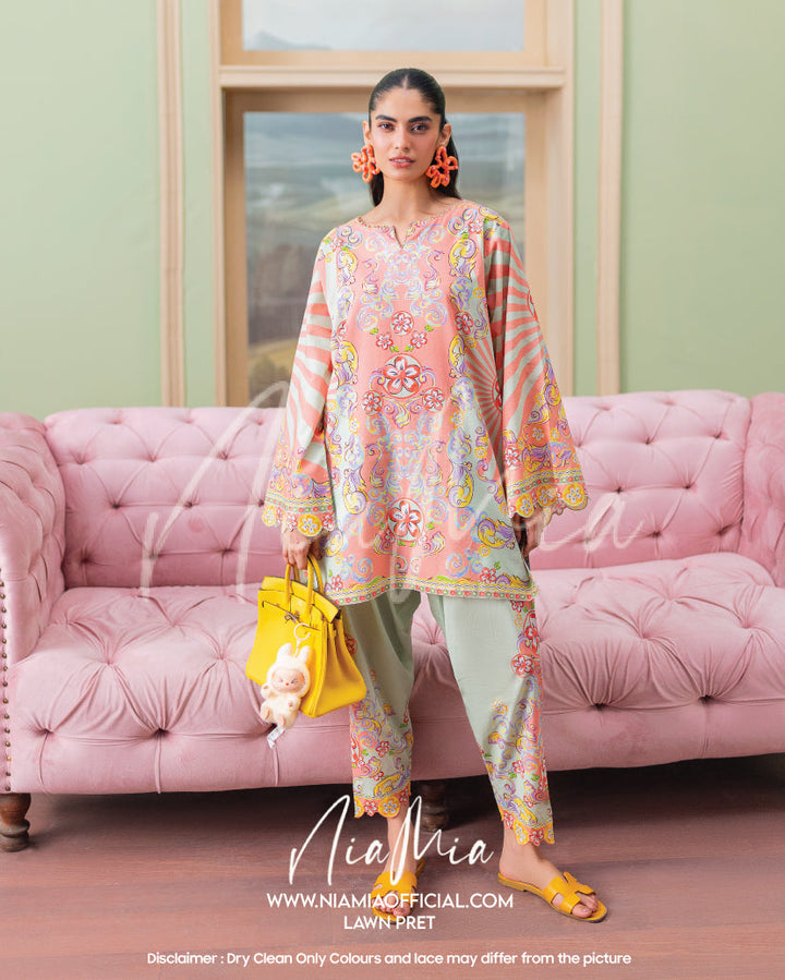 A two-piece printed set on a fresh mint green base, brought to life with coral, lilac, and yellow floral motifs. The neckline is finished with delicate knot detailing, while scalloped cutwork adorns the sleeves for a light, summery finish. Paired with a matching printed shalwar for an airy yet refined look.