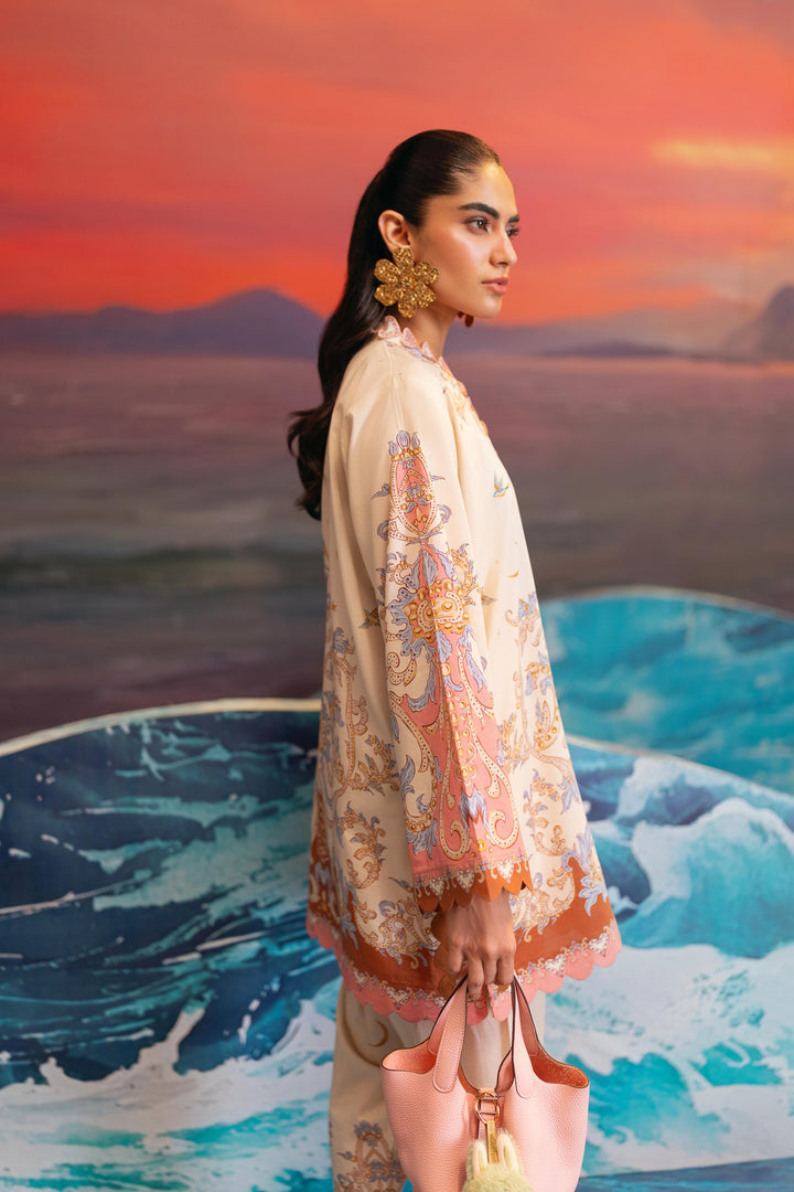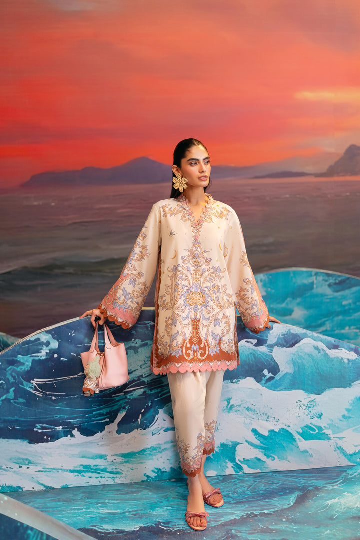A two-piece printed set in soft beige, brought to life with warm brown motifs. The shirt features a soft heart-shaped neckline adorned with embroidered and cutwork 3D hearts, adding a playful yet refined touch. Finished with delicate border detailing on the sleeves and hem, and paired with a matching printed shalwar for a coordinated summer look.
