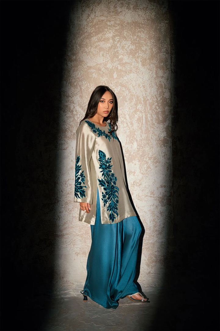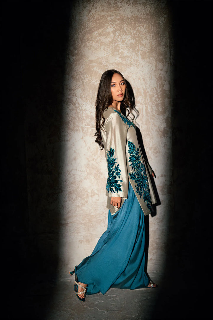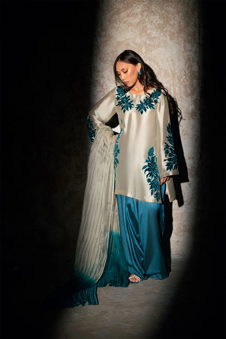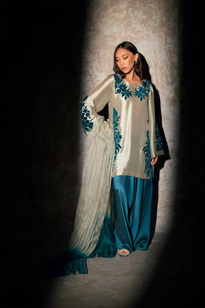 This vibrant and graceful three piece ensemble is crafted from luxurious butter silk. The old silver shirt is beautifully adorned with teal velvet appliqué, further enhanced with intricate handwork that adds a touch of elegance and charm. It is paired with teal shalwar style pants that perfectly complement the shirt. Completing the look is a stunning double shaded organza dupatta, designed with soft pleats for a refined and sophisticated finish.
