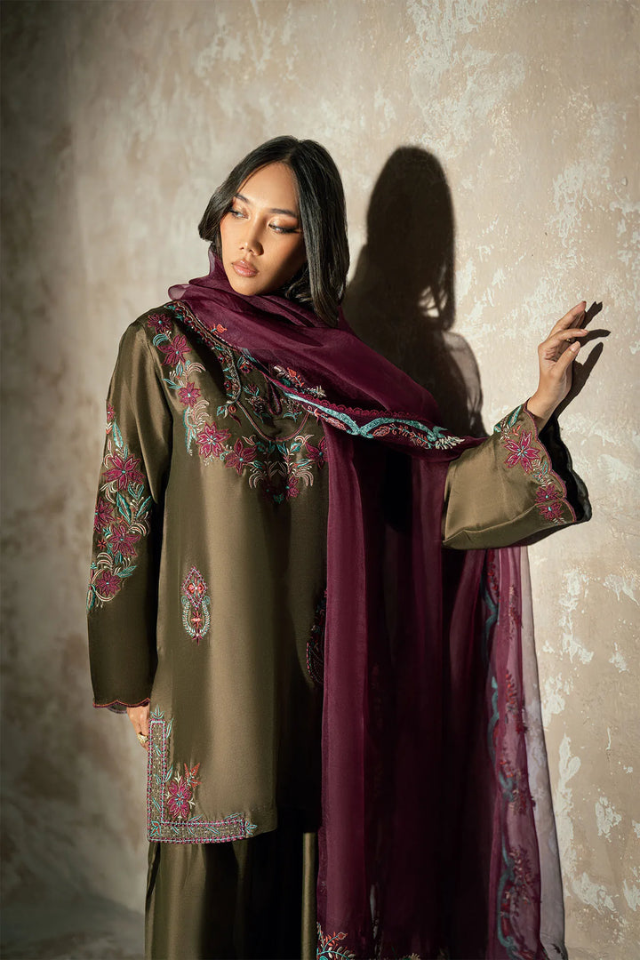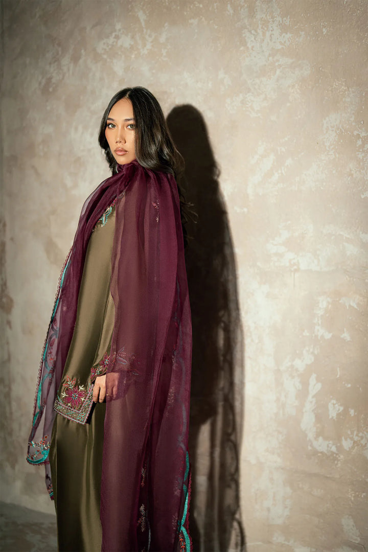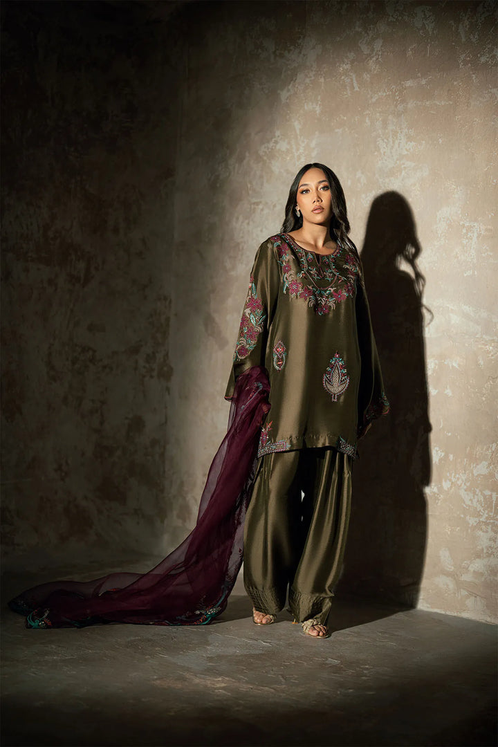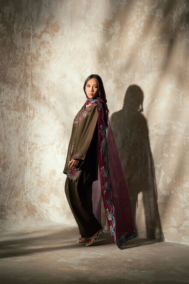 This exquisite three piece butter silk espresso colour outfit radiates elegance and sophistication. The shirt is beautifully adorned with fine embroidery, adding a touch of luxury and intricate detail to the design. It is paired with a traditional farshi shalwar that enhances the overall grace and flow of the ensemble. The look is completed with a stunning plump colored dupatta, delicately embellished with embroidered borders for a refined and polished finish. Perfect for festive occasions, wedding events, or elegant gatherings, this ensemble captures timeless beauty and charm.