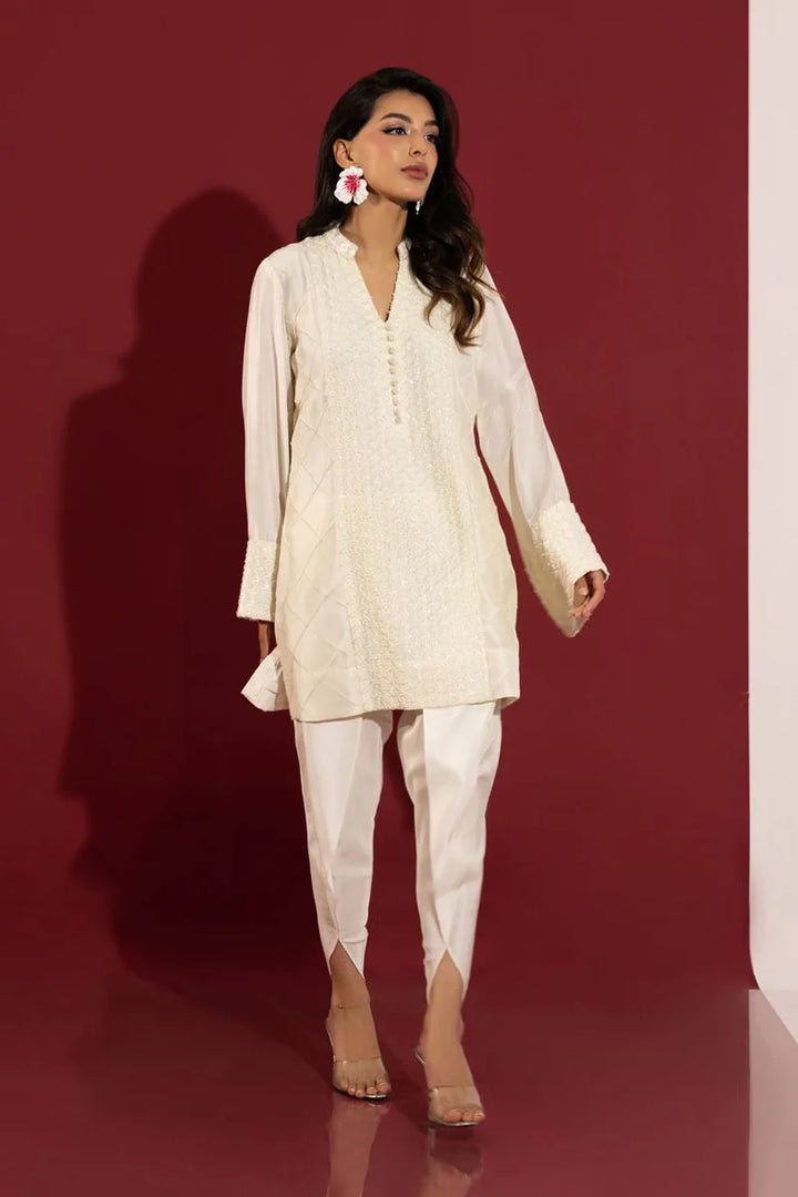 Azmir - luxe fabrics and captivating details for the ultimate wardrobe refresh. This stunning Relaxed-fit Pleated kurta has embroidery on the front of the panel and sleeves with beadwork detailing to give it that extra shine, the relaxed, much-loved silhouette is a must have for the season, paired with our tulip shalwar. Shirt length is 34 inches & cannot increase.