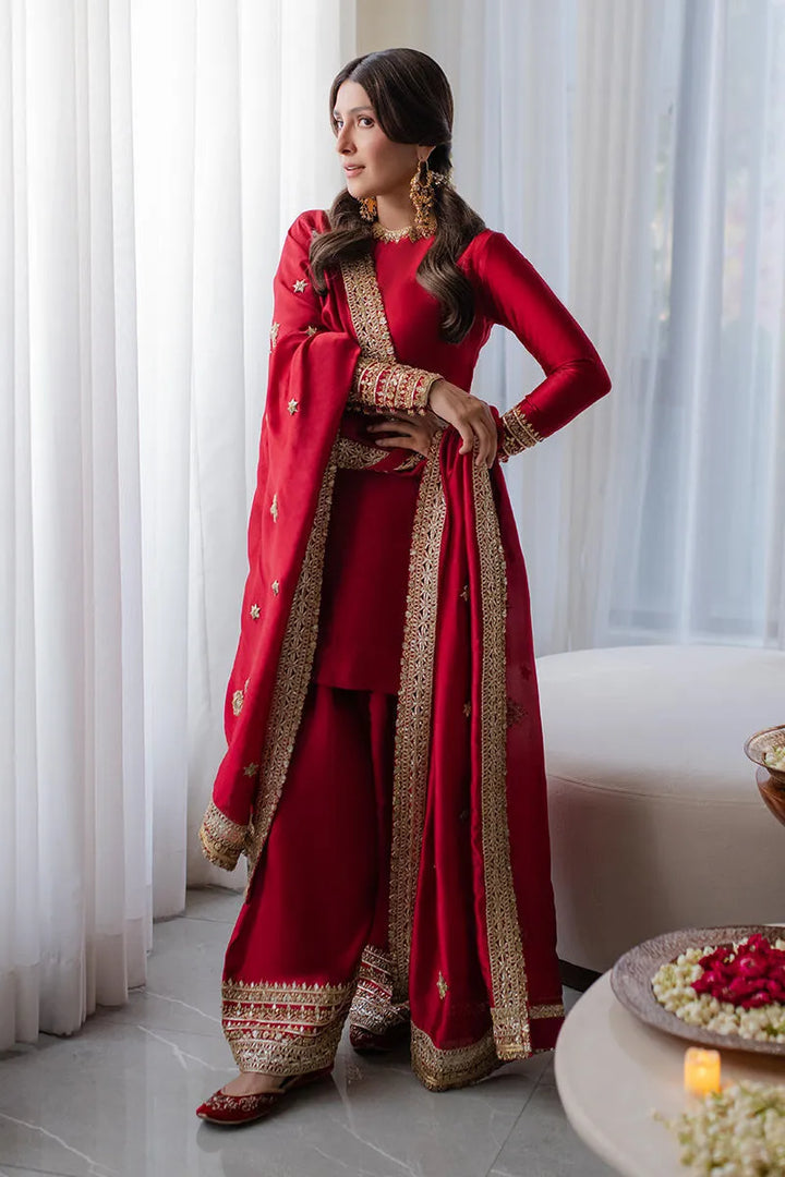 Ayeza Khan looks drop-dead gorgeous in this custom-made silhouette. It features a short shirt with gota and handwork detailings along the neckline with rich handwork on the sleeves, paired with a beautiful shalwar with heavy work on the paincha. The chaddar has gota work along all four sides and botis all over.