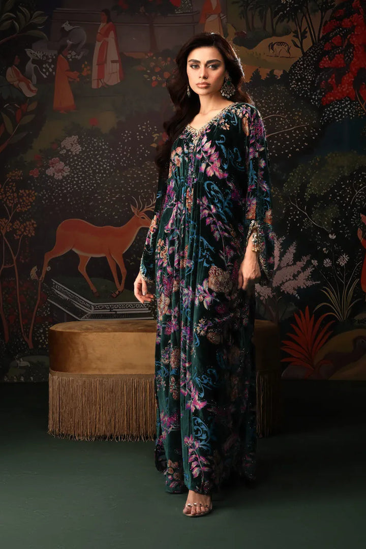 This eye-catching floral kaftan is super chic, The kaftan has a burst of crystals all over with delicate handwork along the neckline, with the classic statement MDR neckline at the back detailed with tassels on the sleeves. Full length is 58 Inches.