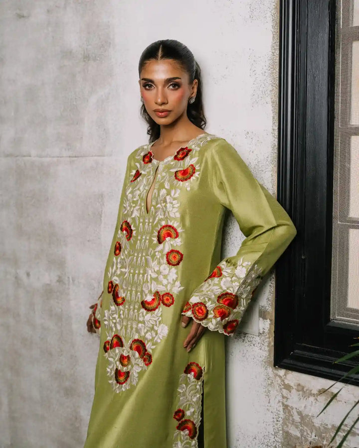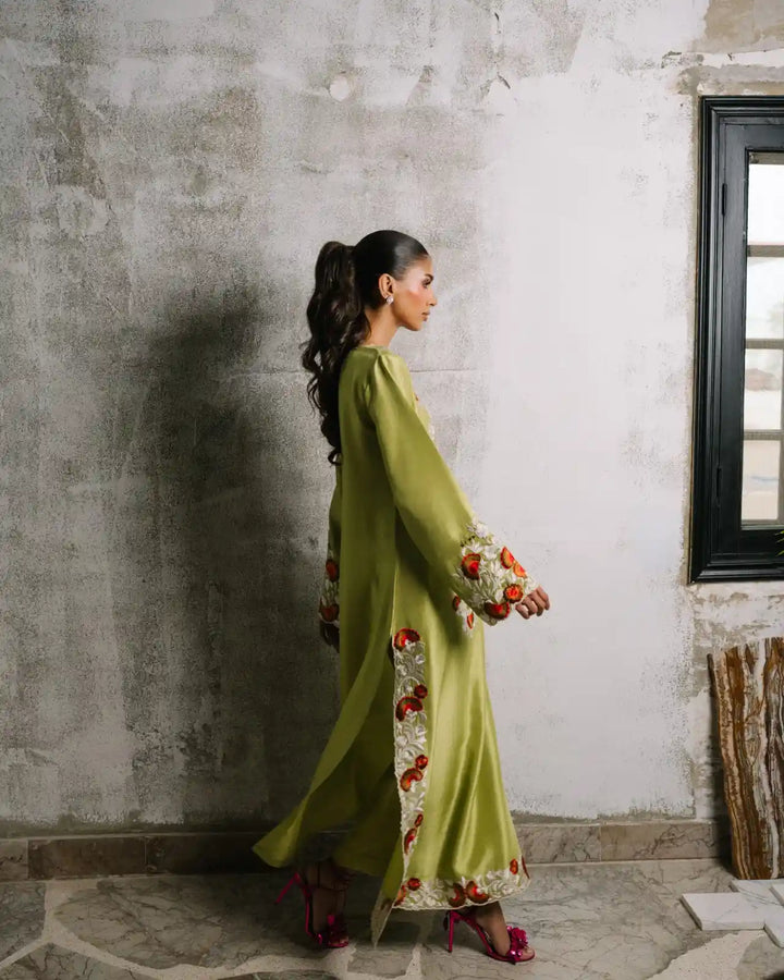 elongated sleeves, and daring high slits. Drenched in vibrant, intricate embroidery.
