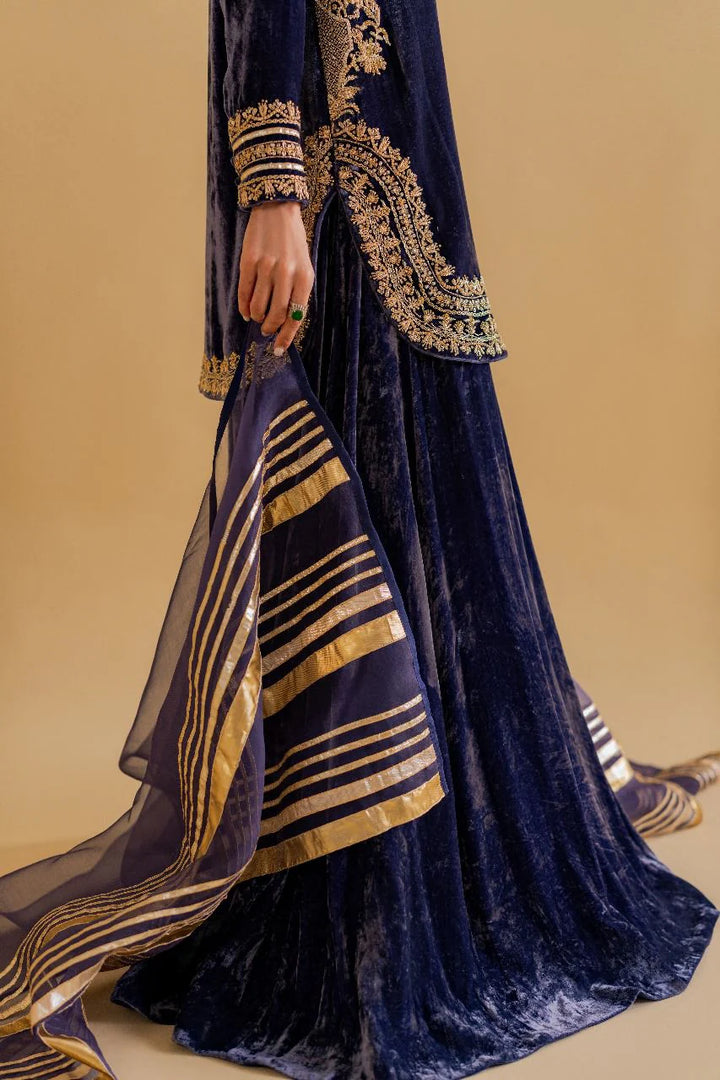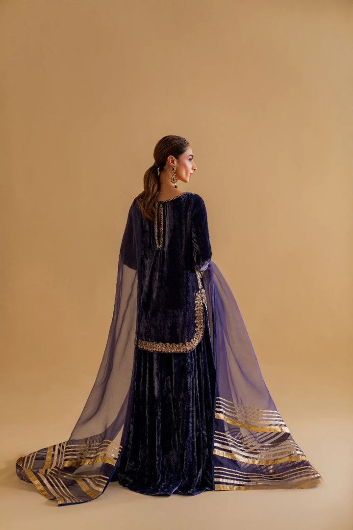 A deep, romantic blue pure French velvet ensemble, lavishly hand-embellished with intricate resham work, makes for a chic and elegant choice in winter festive dressing. The short shirt silhouette, paired with a graceful sharara, the perfect balance of glamour and poise, making Sila a perfect pick for mehndi, sangeet, or rukhsati occasions. Styled with a pure organza dupatta finished with delicate lace, this timeless outfit is destined to be a true head-turner.
