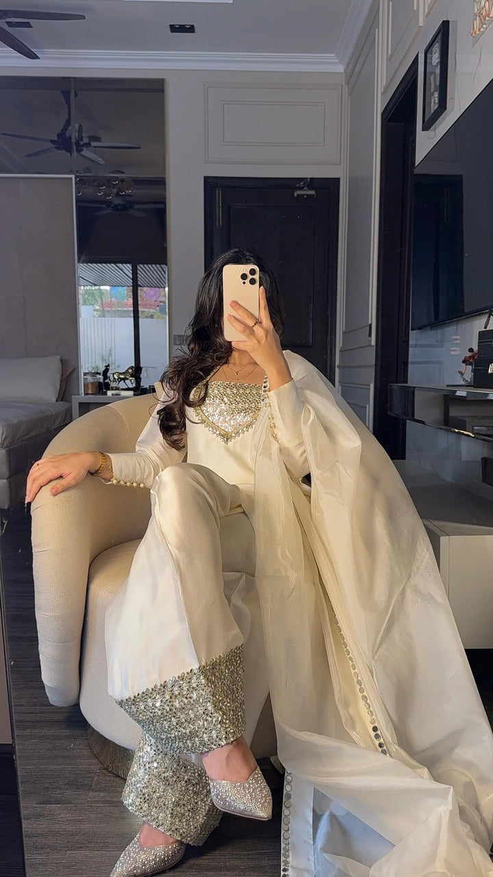 A lightweight silk dupatta, delicately bordered with mirror accents, completing the ensemble with understated grace.
